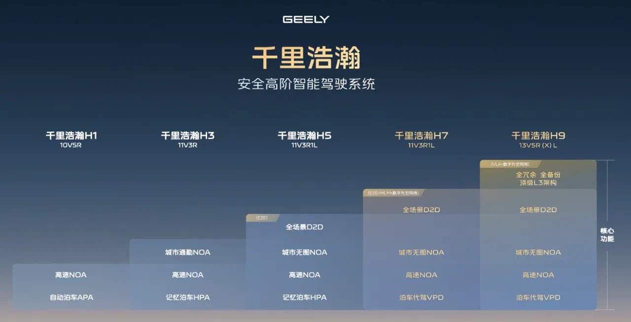 继比亚迪发布“天神之眼”智驾系统、喊出“全民智驾”口号之后,吉利汽车也扛起了“智驾平权”“安全平权”的大旗。 3月3日,吉利汽车正式发布了统一的智驾解决方案――“千里浩瀚”,主打“智驾平权”和“安全平权”两大特色。官方信息显示,千里浩瀚拥有行业最大的软硬件带宽,将覆盖集团全系不同价位车型,满足不同用户的差异化诉求,让更多车主都能享受到“全国都能开,哪里都好开”的智驾体验。 据了解,千里浩瀚规划了H1、H3、H5、H7、H9共5大层级智驾方案。其中,H1起步配置方案的算力超过100TOPS,最顶级的H9方案则具备全冗余、全备份的L3架构,支持行业最大车端算力的双Thor U芯片。吉利汽车称,该方案是首个具有量产落地能力的L3级智能驾驶解决方案。