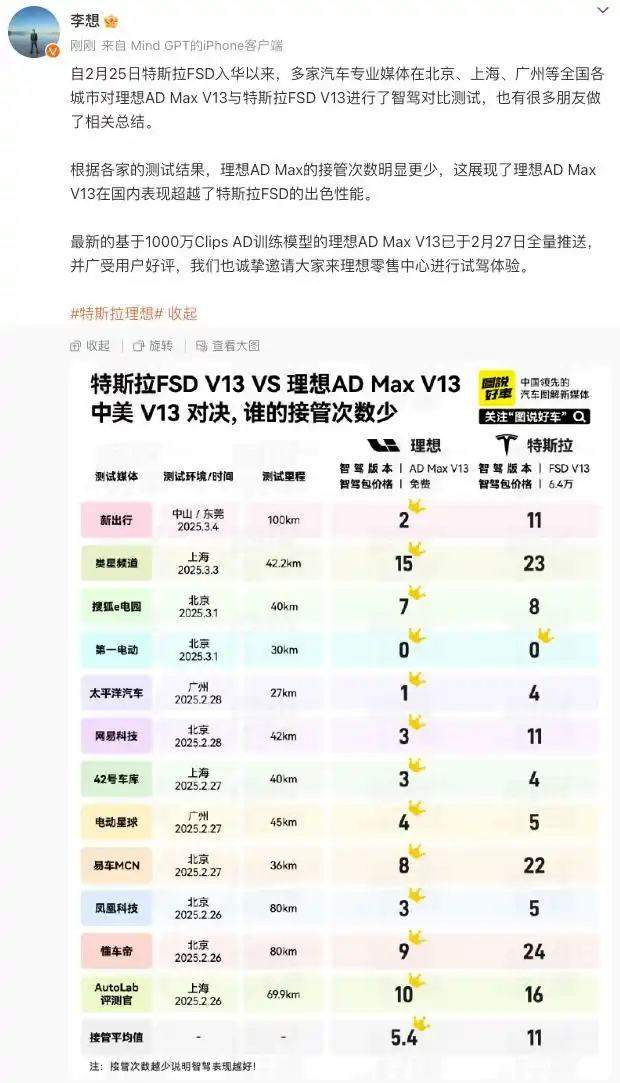 格隆汇3月5日|理想汽车CEO李想在微博发文称,自2月25日特斯拉FSD入华以来,多家汽车专业媒体在北京、上海、广州等全国各城市对理想ADMaxV13与特斯拉FSDV13进行了智驾对比测试,也有很多朋友做了相关总结。根据各家的测试结果,理想ADMax的接管次数明显更少,这展现了理想ADMaxV13在国内表现超越了特斯拉FSD的出色性能。 (责任编辑:宋政 HN002)
