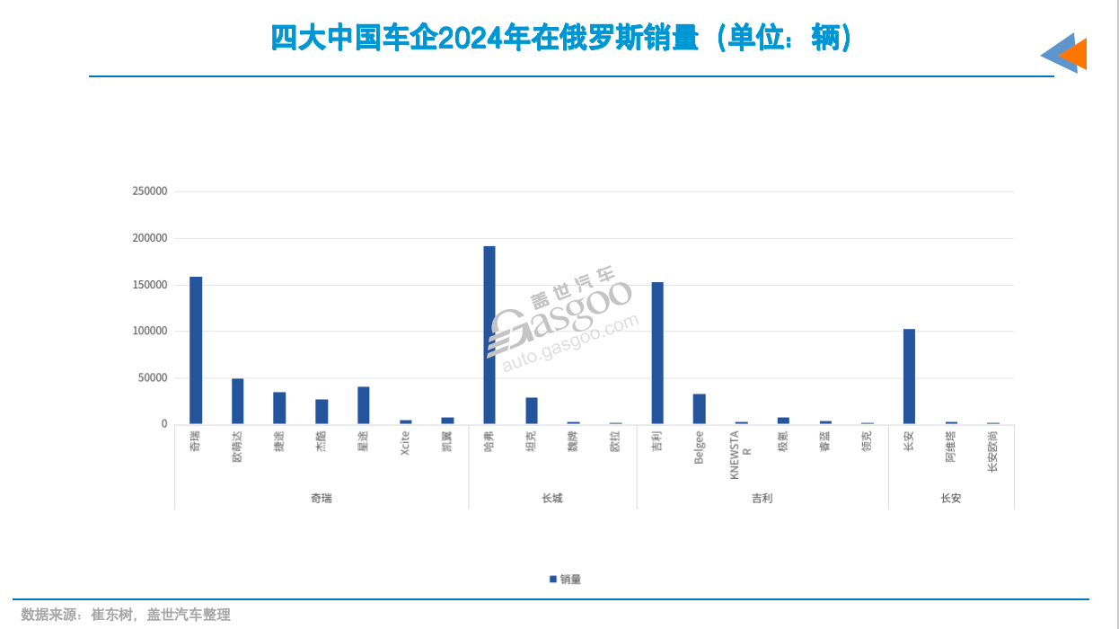 甲醇轮船,图片来源:吉利汽车 长安汽车也是俄罗斯市场不可忽视的中国品牌,去年销量突破10万辆。长安品牌跻身2024年俄罗斯品牌销量前十,市占率约7%。 此外,江淮汽车(600418)、理想汽车、广汽集团(601238)等中国车企在俄罗斯也占有一定市场份额,年销量均超过2万辆。值得一提的是,理想汽车是通过平行进口方式进入俄罗斯市场,而非官方渠道。有消息称,理想L7/L9在俄罗斯售价约为国内的两倍,且供不应求。 然而,这也意味着,一旦俄乌冲突结束,跨国竞争对手重返俄罗斯,当前销量领先的中国车企将面临最大冲击。 或许正是考虑到这一因素,除长城汽车外,其他中国车企暂未在俄罗斯进行重资产投资,而是通过整车出口、KD组装,或是与本土企业合资生产等模式,布局该市场。据悉,跨国车企退出俄罗斯市场后留下的工厂,现在除了生产本土品牌外,大多已或将利用起来为中国车企代工。 而对比亚迪(002594)、上汽集团(600104)、东风集团等未将重点放在俄罗斯市场的中国车企而言,未来受到的影响相对有限。 如何应对? 尽管过去三年战绩斐然,中国车企在俄罗斯市场的处境却暗藏多重危机。停战后的竞争可能会让这些隐忧暴露无遗。 一是品牌与用户基础的差距。欧韩日等国际车企在俄罗斯经营数十年,品牌影响力根深蒂固。在俄乌冲突前,欧系车(不包括俄罗斯本土品牌)占据了俄罗斯市场约三成份额,其次是韩系(20%)和日系(15%)。即便是离开该市场三年了,其用户群体并未完全流失。 俄罗斯平行进口数据显示,起亚和丰田月均销量仍维持在1500辆左右,宝马和奔驰也有600辆的水平。这些数据表明,跨国品牌的市场号召力依然存在。反观中国车企,虽然销量暴增,但品牌认知度和用户黏性仍需时间积累。
