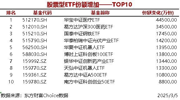 每经AI快讯,据东方财富Choice数据统计,昨日共9只股票型ETF当日份额增加超1亿份,华宝中证医疗ETF增加4.45亿份,易方达沪深300医药ETF增加3.45亿份。