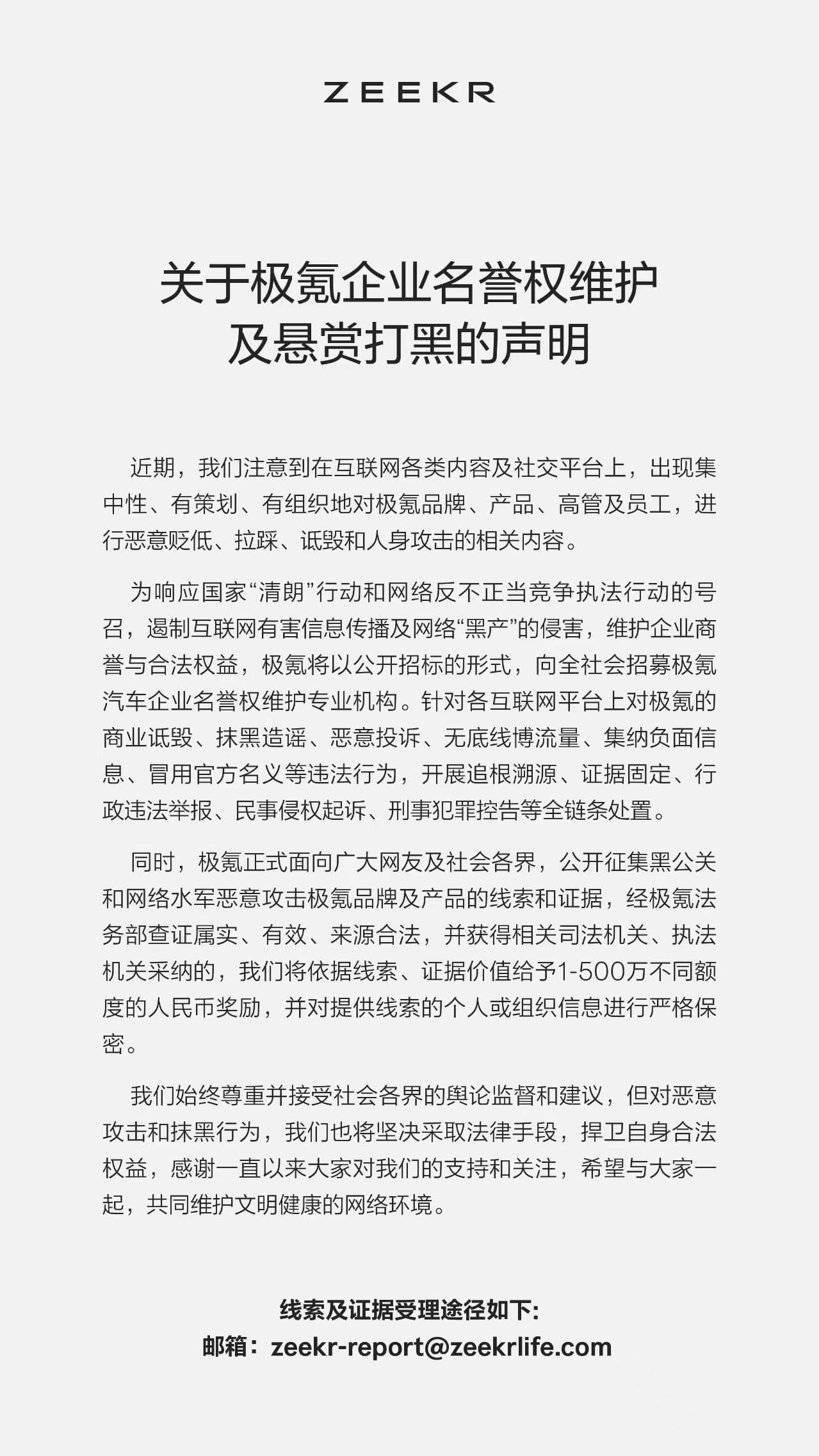 格隆汇3月6日|极氪汽车发布公告,将针对商业诋毁、抹黑造谣、恶意投诉、无底线博流量、集纳负面信息、冒用官方名义等损害企业声誉的不法行为,面向全社会公开招募专业机构合作,开展证据固定和违法犯罪举报、起诉等全链条处置,以法律手段维护自身权益。同时,极氪公开征集黑公关和网络水军恶意攻击的线索和证据,经查证属实、有效、来源合法,并获得相关司法机关、执法机关采纳的,将依据线索、证据价值给予1万-500万元不同额度的人民币奖励。