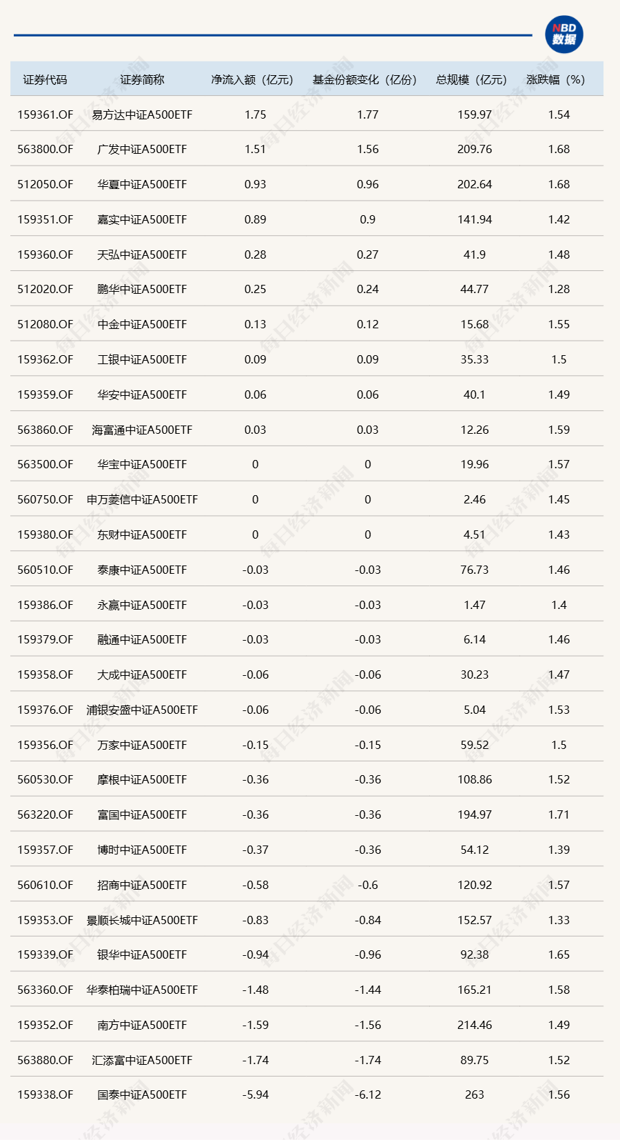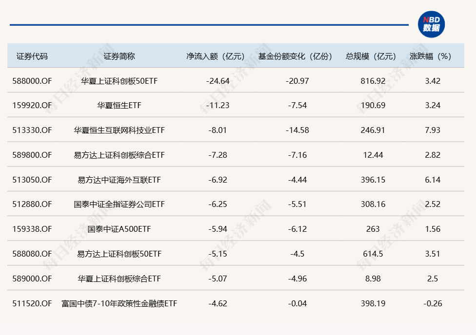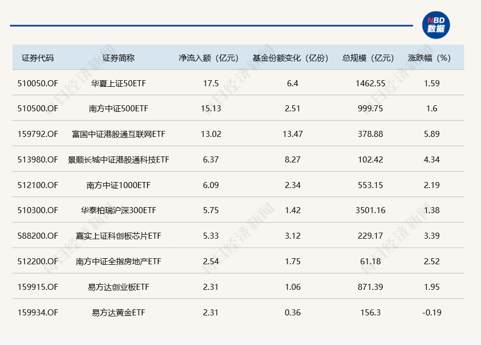 每经记者 肖芮冬 每经编辑 赵云 昨日市场高开高走,创业板指领涨。板块方面,AI智能体、IT服务、游戏、算力租赁等板块涨幅居前,工程机械、钢铁、银行、油气等板块跌幅居前。全市场超4200只个股上涨,沪深两市全天成交额1.91万亿元,较上个交易日放量4126亿元。 Wind数据显示,在3月6日的非货币ETF市场中,华夏上证50ETF基金份额增加6.4亿份,净流入额为17.5亿元;南方中证500ETF基金份额增加2.51亿份,净流入额为15.13亿元;富国中证港股通互联网ETF基金份额增加13.47亿份,净流入额为13.02亿元。 与此同时,华夏上证科创板50ETF基金份额减少20.97亿份,净流出额为24.64亿元;华夏恒生ETF基金份额减少7.54亿份,净流出额为11.23亿元;华夏恒生互联网科技业ETF基金份额减少14.58亿份,净流出额为8.01亿元。 此外,昨日场内29只中证A500ETF合计净流出8.63亿元,其中有10只获得资金增持。 总体看来,Wind数据显示,3月6日全市场ETF份额达到26051.24亿份;总规模为38731.73亿元;日均成交额为3018.68亿元。份额增加最大的行业为消费,目前有10只基金跟踪;份额增加最大的主题为中证机器人指数,有5只基金跟踪。份额增加最大的指数标的为港股通互联网(+10.99%),有4只基金跟踪;收益最高的指数标的为恒生互联网科技业(+7.38%),有2只基金跟踪。 |
