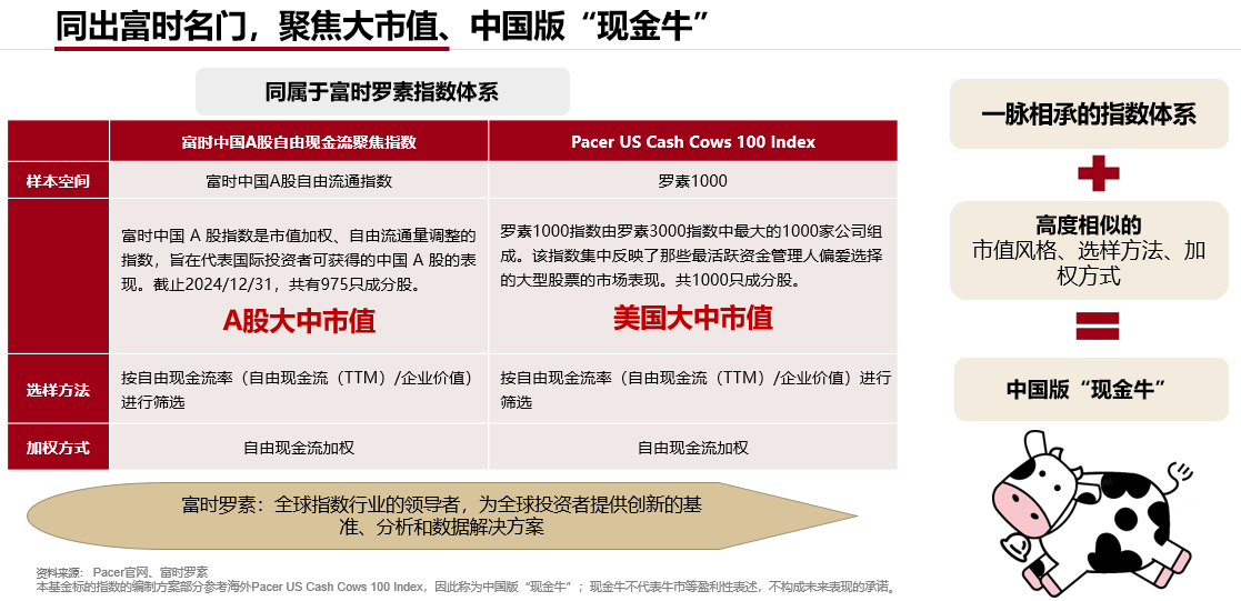 每经编辑 赵云 最近随着首批现金流ETF(159399)的上市,越来越多投资者开始关注自由现金流策略,现金流ETF上市以来场内也交投活跃,吸引了大量市场关注。 目前上市的现金流ETF(159399)跟踪富时中国A股自由现金流聚焦指数,与全球市场上规模最大的现金流ETF——Pacer US Cash Cows 100 ETF标的指数师出同门。自由现金流选股策略在国内还是一个相对崭新的策略,对于指数过往的表现很多投资者也有些疑惑,比如为什么能够长期跑赢红利,指数有没有过拟合的问题等等。今天我们就一文详解现金流为什么这么牛,并且说道说道它为啥不存在过拟合。 1、 富时现金流指数的A股方案和美国方案基本一致,该方案已在美国市场得到长期验证 自由现金流策略在海外是一种比较成熟的策略。比如美国Pacer公司在2016年成立的Pacer US Cash Cows 100 ETF目前规模已经超过250亿美元,成为全球规模最大的现金流类ETF。 有意思的是,Pacer U.S. Cash Cows 100 ETF的标的指数Pacer US Cash Cows 100 Index选样范围为罗素1000,与国内首批上市交易的现金流ETF(159399)跟踪的富时中国A股自由现金流聚焦指数同属于富时罗素指数体系。 在编制方案层面,富时中国A股自由现金流聚焦指数与Pacer US Cash Cows 100指数一脉相承,从成熟市场产品上学习优秀经验,并实现了高度本土化适配。在市值风格、选样方法、加权方式等方面高度相似。 具体来看,样本空间上,Pacer U.S. Cash Cows 100 ETF以罗素1000为样本空间,聚焦美国大中市值公司。富时中国A股自由现金流聚焦指数以富时中国A股自由流通指数为样本空间,该指数在富时罗素编制方案的框架下、经过可投资性筛选,选出覆盖A股大中市值股票的投资范围,最新样本共计975只。这个样本空间为现金流指数的可投资性提供了基础保证。另外,在选样方法上,两个指数均按照自由现金流率进行筛选,也都按照自由现金流加权。 富时现金流指数的A股方案和美国方案基本一致,而美国方案对应的Pacer U.S. Cash Cows 100 ETF早在2016年就成立,目前已经成功运作近10年、得到了美国市场的长期检验。目前该ETF已成为海外市场规模最大、最受欢迎的自由现金流策略ETF。这充分说明了富时现金流指数编制方案的有效性和合理性。此次国内的现金流ETF(159399)也使用富时罗素成熟的指数体系,可谓师出名门,有望打造中国版“现金牛”。 Pacer U.S. Cash Cows 100 ETF的规模壮大,一方面体现出在全球经济不确定增强的背景下,投资者更关注企业的基本面和现金流状况。另一方面,其长期可观收益也了吸引大量资金涌入。 根据华福证券数据,以Pacer US Cash Cows 100 ETF、嘉信理财美国股利股票ETF、领航价值型ETF分别作为美国现金流、红利、价值ETF的代表。自2016年12月19日至2025年1月24日,Pacer US Cash Cows 100 ETF的年化收益为11.10%,夏普比率为0.54,同期嘉信理财美国股利股票ETF、领航价值型ETF的年化收益分别为8.39%、8.11%,夏普比率分别为0.48、0.47,Pacer U.S. Cash Cows 100 ETF的收益和夏普比率表现整体较优,能获得长期稳健的收益。 可以看出,Pacer U.S. Cash Cows 100 ETF跟踪的美版富时现金流指数不光历史表现突出,还长期跑赢价值、红利等其他因子,可谓是对富时罗素现金流指数有效性和合理性的最好注解。 2、 不仅在美国,现金流策略在欧洲市场同样有效 无独有偶,美国市场的“现金牛”行情其实在中国和欧洲市场上也在同步上演。根据中金公司研究部测算,2020年以来中、美、欧市场上“现金牛”指数 (以本币计价)表现不俗,而且趋势跑赢相应的大盘指数。 如果说美国这样的长牛市场为现金流指数的优秀表现提供了沃土,那么在相对波动更大一些的欧洲市场,现金流策略的有效性就更能进一步说明问题。上图可以看出,美国的现金牛相对标普500指数有接近60%的超额,中国的现金牛相对深300有40%多的超额,欧洲的现金牛相对斯托克600指数也有接近60%的超额。 自由现金流这个指标不仅仅在美国和中国有效,在欧洲市场也同样有效。究其原因,还是要回到自由现金流策略的本源,它其实是把具有强劲竞争实力的上市公司筛选出来的一个重要指标。因为自由现金流意味着企业的货物能卖出去、并且货款还能收回来,意味着企业不会被应收账款拖垮,这样的企业本身就具有非常强的竞争能力。 3、 富时中国A股自由现金流聚焦指数夏普比率优于同类,忠于追求自由现金流的本质和聚焦大中盘股的特性 根据历史数据来看,无论是富时中国A股自由现金流聚焦指数,还是国内的其他两只现金流指数,长期表现均跑赢中证红利指数。而且都是从2020年前后开始超额逐步走阔。这种趋势与前文提到的美国、欧洲市场现金流的表现也比较一致。 从波动率来看,富时中国A股自由现金流聚焦指数自基日(2013/12/31)以来截至24年底的年化波动率是22.63%,相比同类现金流指数更小一点,比中证红利指数更高一点。但是从收益来看,富时中国A股自由现金流聚焦指数年化回报20.14%,同期的中证红利指数年化是13.6%。也就是说,富时中国A股自由现金流聚焦指数相比红利指数高出来的一点波动率,带来了更大的收益提升,使得其夏普比率大幅提升,达到0.93,远高于红利指数的0.71。 可以看出,市场上几个现金流指数的夏普比率都在0.9以上,只不过富时中国A股自由现金流聚焦指数因为聚焦于大中市值,所以它的波动更小一点,夏普比也更高一些。 如果真的是为了追求过拟合,富时现金