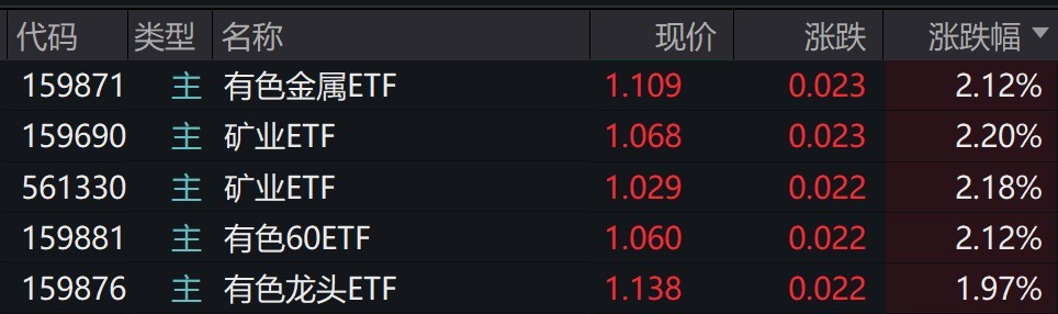 每经记者 叶峰 每经编辑 肖芮冬 有色金属概念股走强,华友钴业涨超3%,紫金矿业、洛阳钼业、云铝股份涨超2%。 受重仓股上涨影响,有色金属、矿业相关ETF涨约2%。 有券商表示,2025年,有色金属板 ...