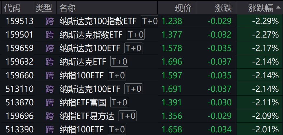每经记者 叶峰 每经编辑 肖芮冬 美股周四收跌。道指跌427.51点,跌幅为0.99%,报42579.08点;纳指跌483.48点,跌幅为2.61%,报18069.26点;标普500指数跌104.11点,跌幅为1.78%,报5738.52点。 纳指较去年12月创造的历史最高收盘纪录下跌超过10%,意味着进入回调区域。 受盘面影响,多只跟踪纳指100的ETF早盘跌逾2%。 |