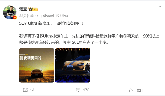 0新浪科技讯3月7日上午消息,小米创办人,董事长兼CEO雷军上午在网络社交平台表示,调研了很多Ultra小定车主,先进的智能科技是这群用户特别喜欢的,90%以上都是传统豪车转过来的,其中56E用户占了一半多。56E是指在 ...