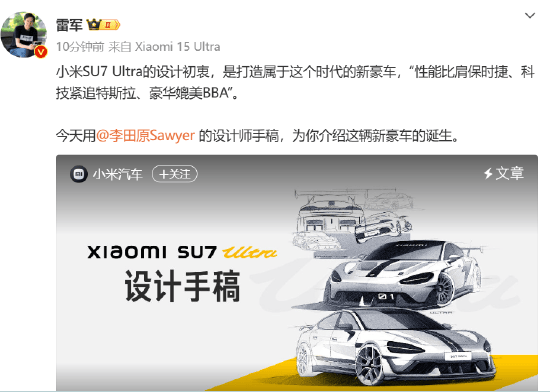 同辰科技讯 3月7日下午消息,小米创办人,董事长兼CEO雷军在网络社交平台表示,小米SU7 Ultra的设计初衷,是打造属于这个时代的新豪车,“性能比肩保时捷、科技紧追特斯拉、豪华媲美BBA”。