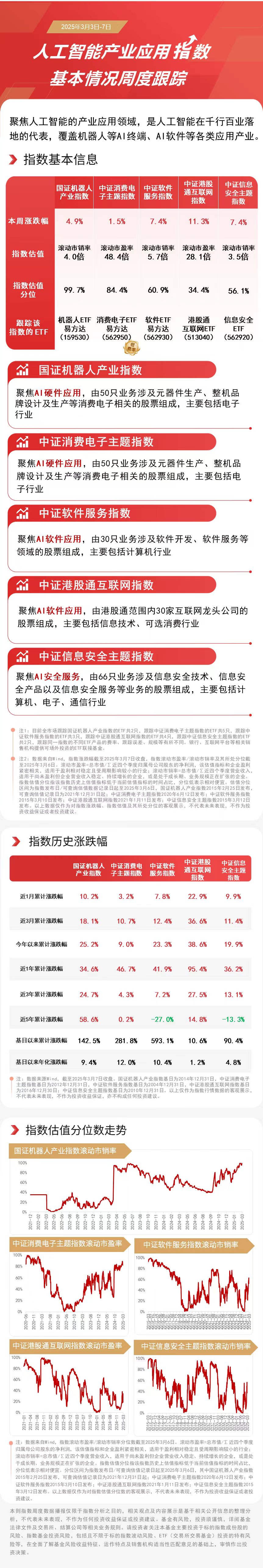 本周,中证港股通互联网指数上涨11.3%,中证软件服务指数、中证信息安全主题指数均上涨7.4%,国证机器人产业指数上涨4.9%,中证消费电子主题指数上涨1.5%。 万联证券表示,随着硬件底座夯实、模型部署成本下降,以及 ...