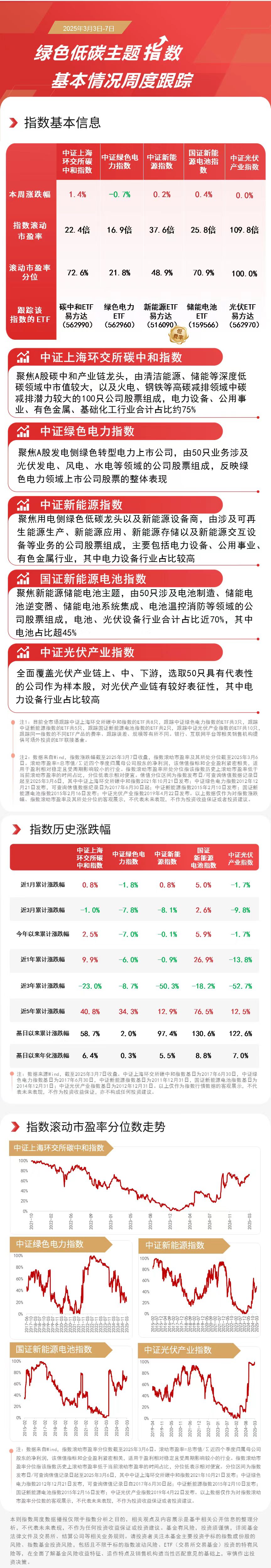 本周,中证上海环交所碳中和指数上涨1.4%,国证新能源电池指数上涨0.4%,中证新能源指数上涨0.2%,中证光伏产业指数上涨0.02%,中证绿色电力指数下跌0.7%。 今年的《政府工作报告》中提到加快发展绿色低碳经济以及积 ...