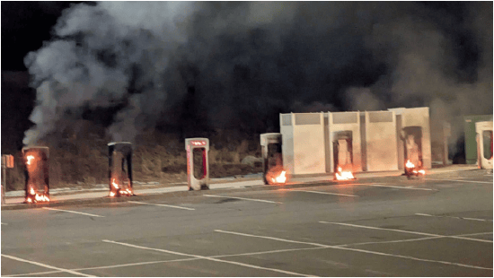 就在上周,马萨诸塞州波士顿附近的利特尔顿,整个特斯拉超级充电站都被纵火焚烧。袭击者用汽油浇在了充电站上再恶意点燃。由于涉及电力起火,消防队赶到之后也无法采取有效措施,需要先切断电力供应才能灭火,只能看着超充站被迅速焚毁。