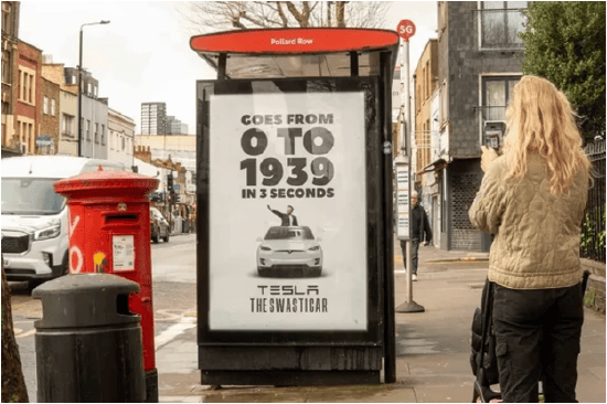 在伦敦街头和地铁,则出现了多个针对马斯克的政治广告,将他的形象与纳粹绑定起来。
