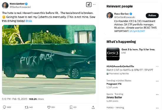 “这是真的仇恨。特斯拉这个品牌已经毁了。我得卖掉我的CyberTruck。”在目睹一辆特斯拉CyberTruck被喷上“Fxxk 马斯克”字样之后,美国知名投资者罗斯・盖博(Ross Gerber)这样感慨说。他认为,针对特斯拉店面、汽车和超级充电桩的破坏报道可能会产生“寒蝉效应”。消费者“可能不想与埃隆联系在一起,也不想面对破坏行为”。 尽管此前投资获利颇丰,但过去一年时间,Gerber Kawasaki已经主动多次抛售特斯拉持股,目前还持有近1亿美元的特斯拉股份。盖博之所以选择抛售特斯拉,主要是对马斯克感到不满。现在他预言特斯拉股价会在2025年腰斩。 盖博认为,马斯克的极端政治和反特斯拉破坏行为对品牌产生了负面影响,最好的解决方案就是马斯克辞去特斯拉CEO职位。“这一切都可以很容易解决,”他说,“让别人接手运营特斯拉就行。” 不过,也有分析师认为目前的状况只是暂时的,特斯拉最终会从马斯克与特朗普的特殊关系中受益。Wedbush证券分析师丹・艾夫斯(Dan Ives)表示,尽管马斯克与特朗普的关系为特斯拉带来了“重大品牌担忧”,但最终会有回报。 他在周四的投资者报告中写道:“这些分心问题会逐渐消退。特朗普入主白宫是马斯克和特斯拉最好的事情,这将创造一个 去监管的(Deregulatory)环境,联邦自动驾驶路线图将成为特斯拉黄金战略愿景的核心。” (责任编辑:王治强 HF013)