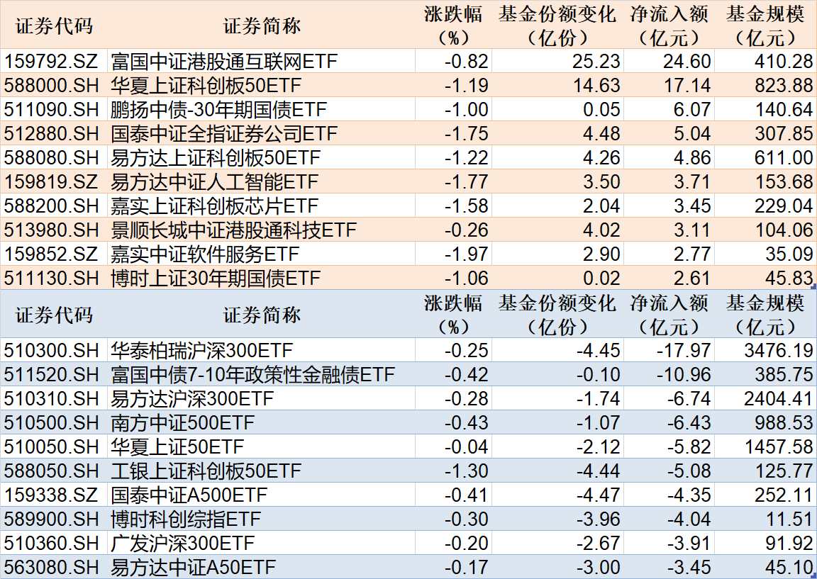 每经记者 叶峰 每经编辑 肖芮冬 上周五市场全天震荡调整,创业板指领跌。从板块来看,军工、有色金属概念股逆势大涨,汽配股震荡走强,机器人概念股局部活跃。下跌方面,固态电池展开调整,算力概念股震荡走低。 Wind数据显示,在3月7日的非货币ETF市场中,富国中证港股通互联网ETF基金份额增加25.23亿份,净流入额24.60亿元;华夏上证科创板50ETF基金份额增加14.63亿份,净流入额17.14亿元;鹏扬中债-30年期国债ETF基金份额增加0.05亿份,净流入额6.07亿元。 与此同时,华泰柏瑞沪深300ETF基金份额减少4.45亿份,净流出额17.97亿元;富国中债7-10年政策性金融债ETF基金份额减少0.10亿份,净流出额10.96亿元;易方达沪深300ETF基金份额减少1.74亿份,净流出额6.74亿元。 此外,上周五场内29只中证A500ETF合计净流出21.32亿元,其中有1只获得资金增持。 总体看来,Wind数据显示,3月7日全市场ETF份额达到26039.38亿份;总规模为38509.50亿元。份额增加最大的行业为金融,目前有23只基金跟踪;份额增加最大的主题为中证人工智能,有3只基金跟踪。份额增加最大的指数标的为港股通互联网(+5.94%),有4只基金跟踪;收益最高的指数标的为军工龙头(+2.37%),有1只基金跟踪。 |