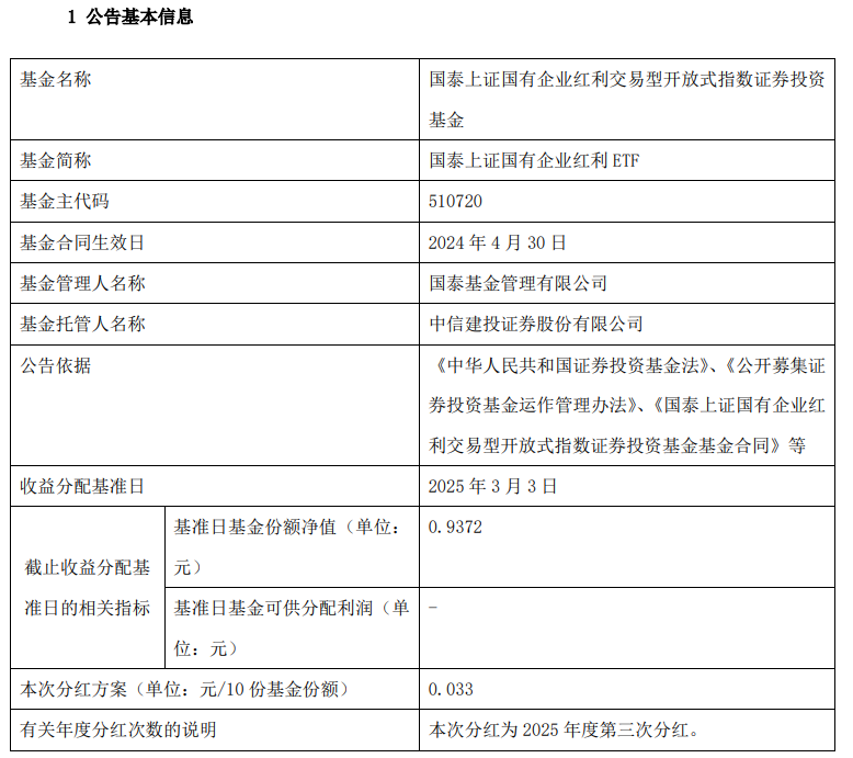 每经编辑 彭水萍 2025年3月10日,红利国企ETF(510720)官宣上市以来的第11次分红,本次分红方案为0.033元/10份基金份额,分红比例0.35%。权益登记日为3月12日,现金红利发放日为3月18日。 值得关注的是,红利国 ...
