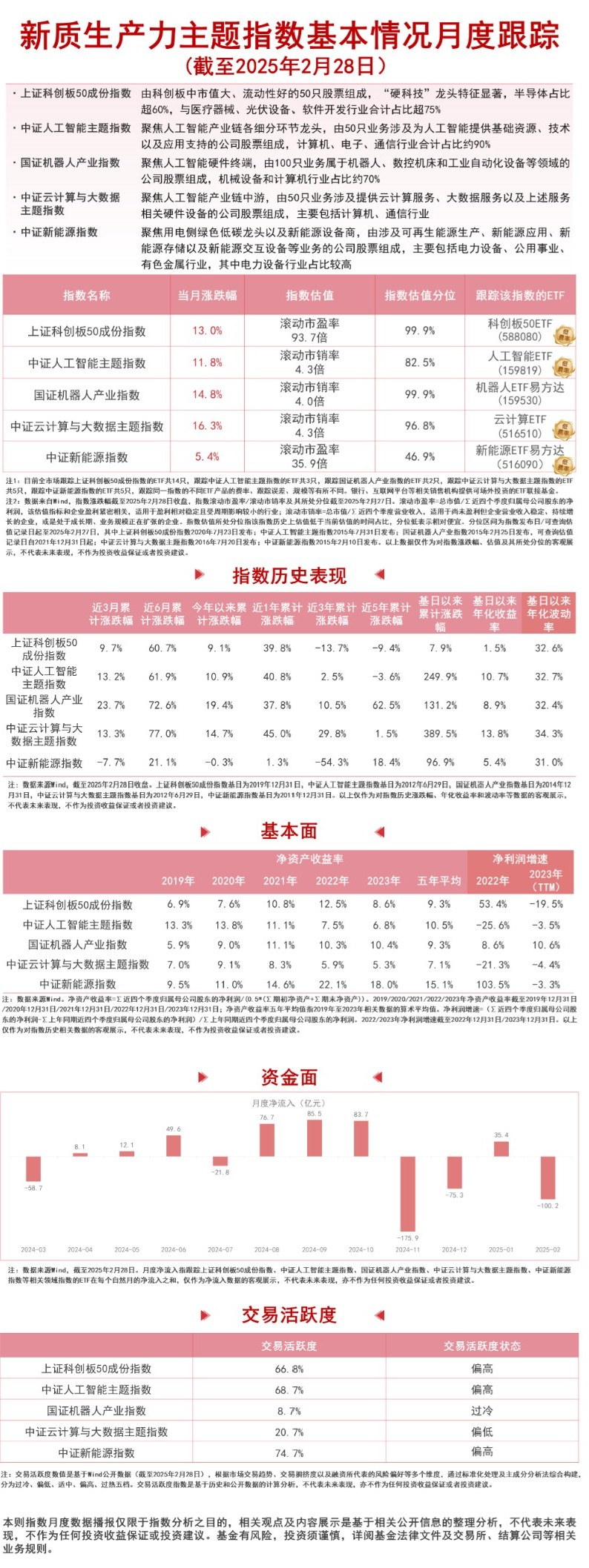 2月,算力、机器人、AI智能体等概念集体拉升,指数方面,中证云计算与大数据主题指数上涨16.3%,国证机器人产业指数上涨14.8%,上证科创板50成份指数上涨13.0%,中证人工智能主题指数上涨11.8%,中证新能源指数上涨5 ...