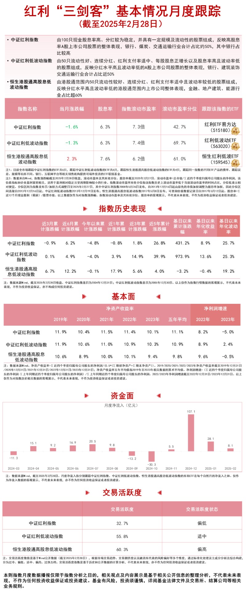 2月,红利“三剑客”指数走势分化,其中恒生港股通高股息低波动指数上涨2.3%,中证红利指数下跌1.6%,中证红利低波动指数下跌1.3%。