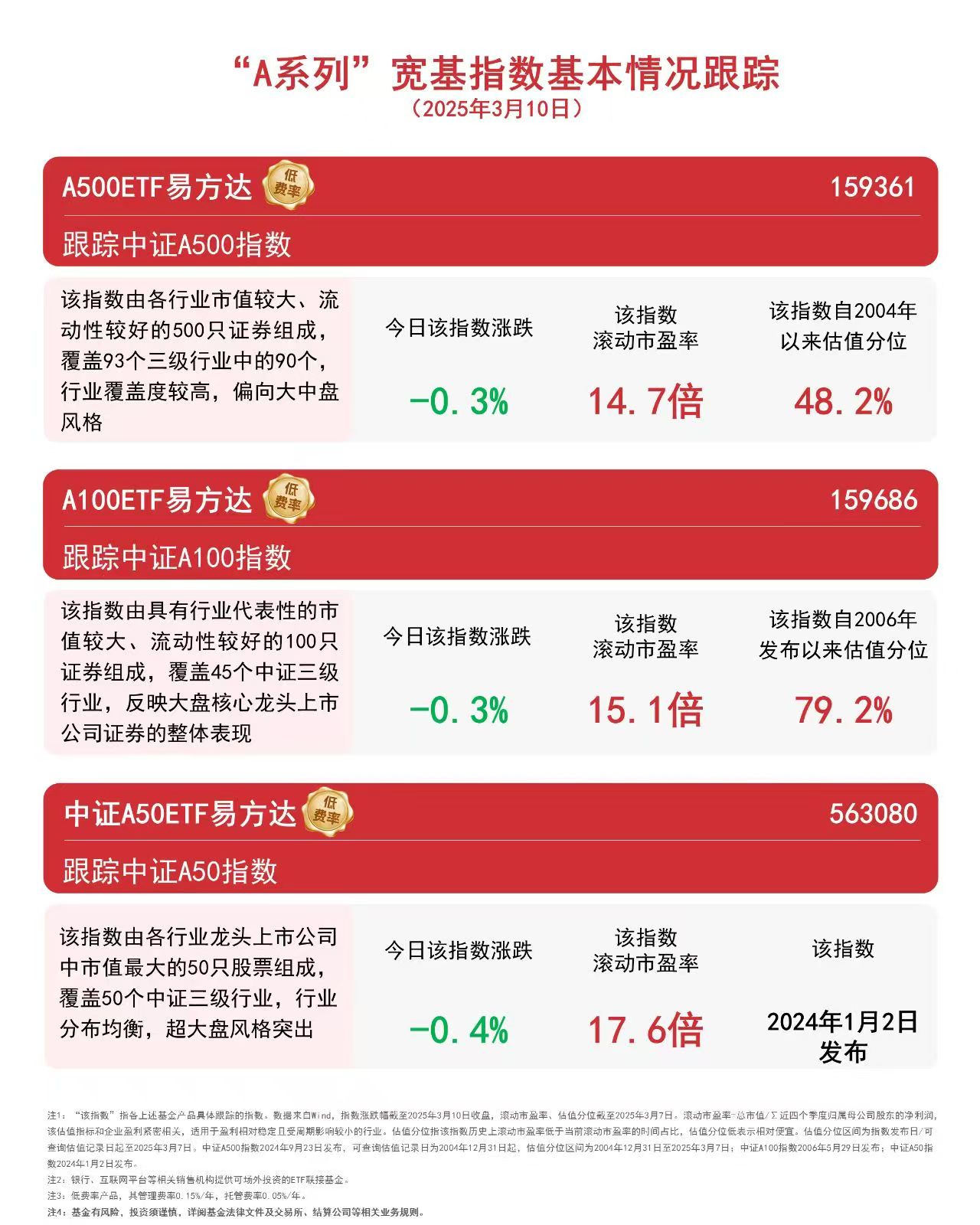 截至收盘,中证A500指数、中证A100指数均下跌0.3%,中证A50指数下跌0.4%。3月以来,A500ETF易方达(159361)获资金净流入近4亿元,居同类产品第一。