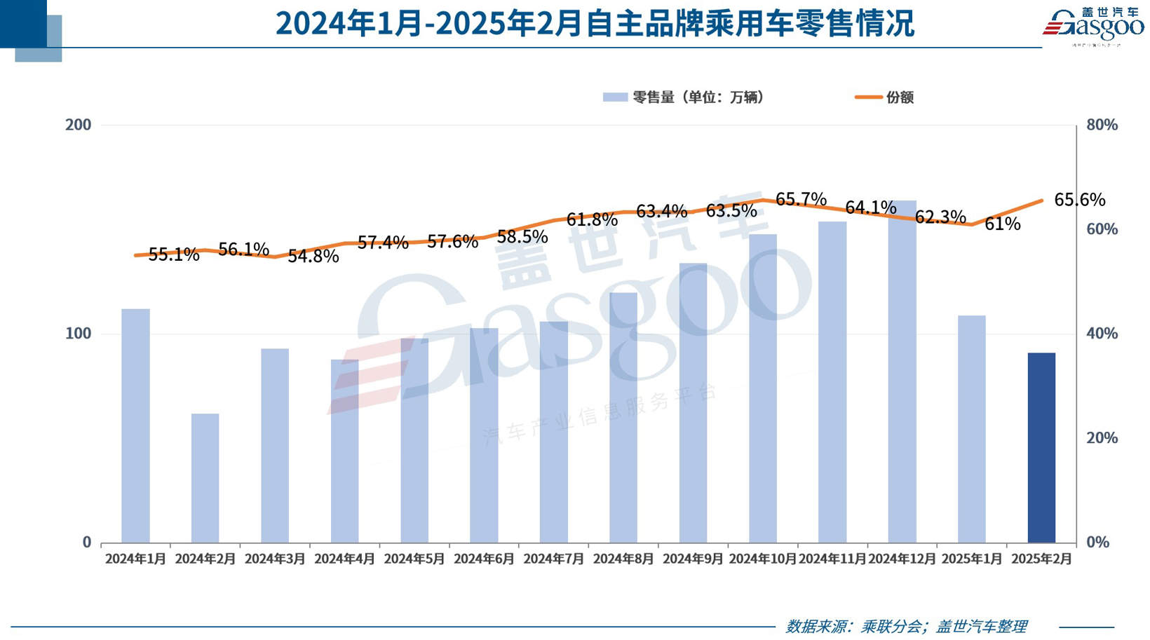 图片来源:乘联分会 据该机构分析,近期国内外宏观环境的变化好于预期,消费者消费心态相对平稳,叠加车企营销活动在春节期间的持续发力和去年2月销量基数低,因此今年2月车市强于2024年春节后的低迷走势,实现2025年2月的春节后开门红。 值得注意的是,节前受春节长途出行及气温影响,消费者对新能源的续航补能更为敏感,新能源渗透率出现显著的季节性回落。随着节后复工和天气转暖等因素影响,消费者的偏好发生明显转变,新能源渗透率逐周快速提升,成为节后乘用车市场恢复的主要驱动力。 自主品牌份额,强势增长 2月,自主品牌表现仍十分亮眼。 乘联分会数据显示,该月自主品牌零售销量达到91万辆,虽环比下降17%,但同比大幅增长51%,展现出强劲的增长势头。由此,自主品牌国内零售份额来到了65.6%,较去年同期提升10.6个百分点。批发层面来看,自主品牌份额更是高达71%,同比提升12个百分点。