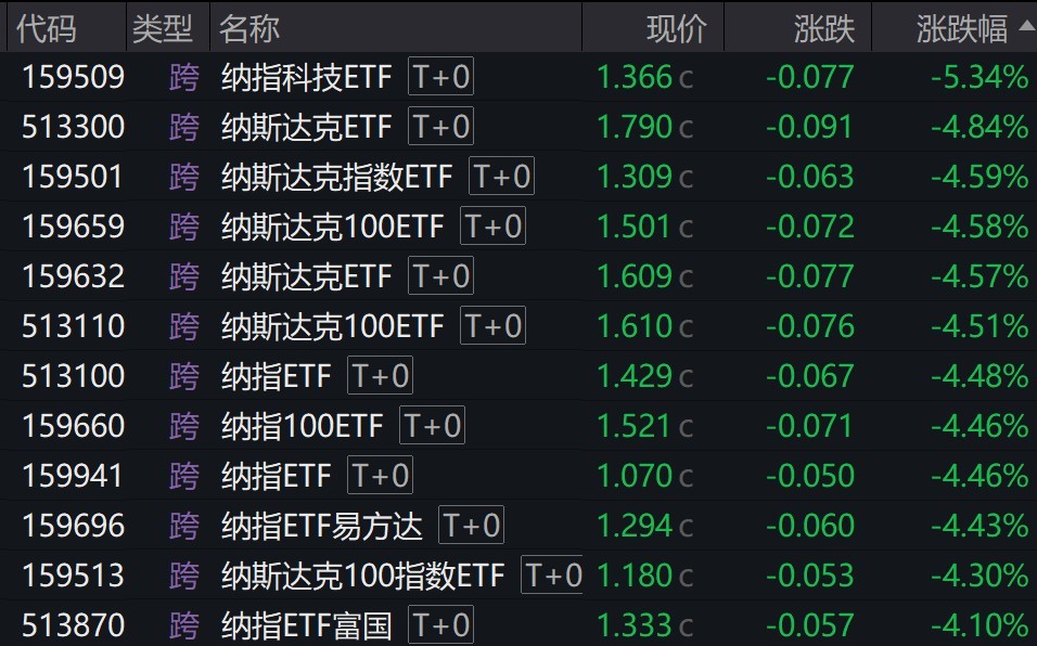 每经记者 叶峰 每经编辑 肖芮冬 美股周一重挫,科技股领跌。道指跌890.01点,跌幅为2.08%,报41911.71点;纳指跌727.90点,跌幅为4.00%,报17468.32点;标普500指数跌155.62点,跌幅为2.70%,报5614.58点。 受美国总统特朗普关税政策影响,美国经济衰退风险上升,引发市场严重担忧。 值得注意的是,纳指下跌4%,创2022年9月以来最大单日跌幅。 受盘面影响,多只纳指相关ETF今日大幅低开逾4%。 |
