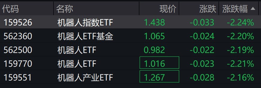 每经记者 叶峰 每经编辑 肖芮冬 机器人概念股走低,双环传动跌超5%,大华股份、机器人跌超3%,石头科技、大族激光、拓邦股份跌超2%。 受重仓股调整影响,跟踪中证机器人指数的ETF跌逾2%。 中证机 ...