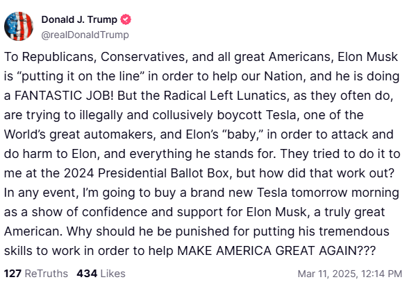 0格隆汇3月11日|美国总统特朗普在社交媒体发文称,马斯克正“冒险挺身而出”以帮助我们的国家,他干得非常出色,但那些激进的人正试图以非法且相互勾结的方式抵制特斯拉 ...