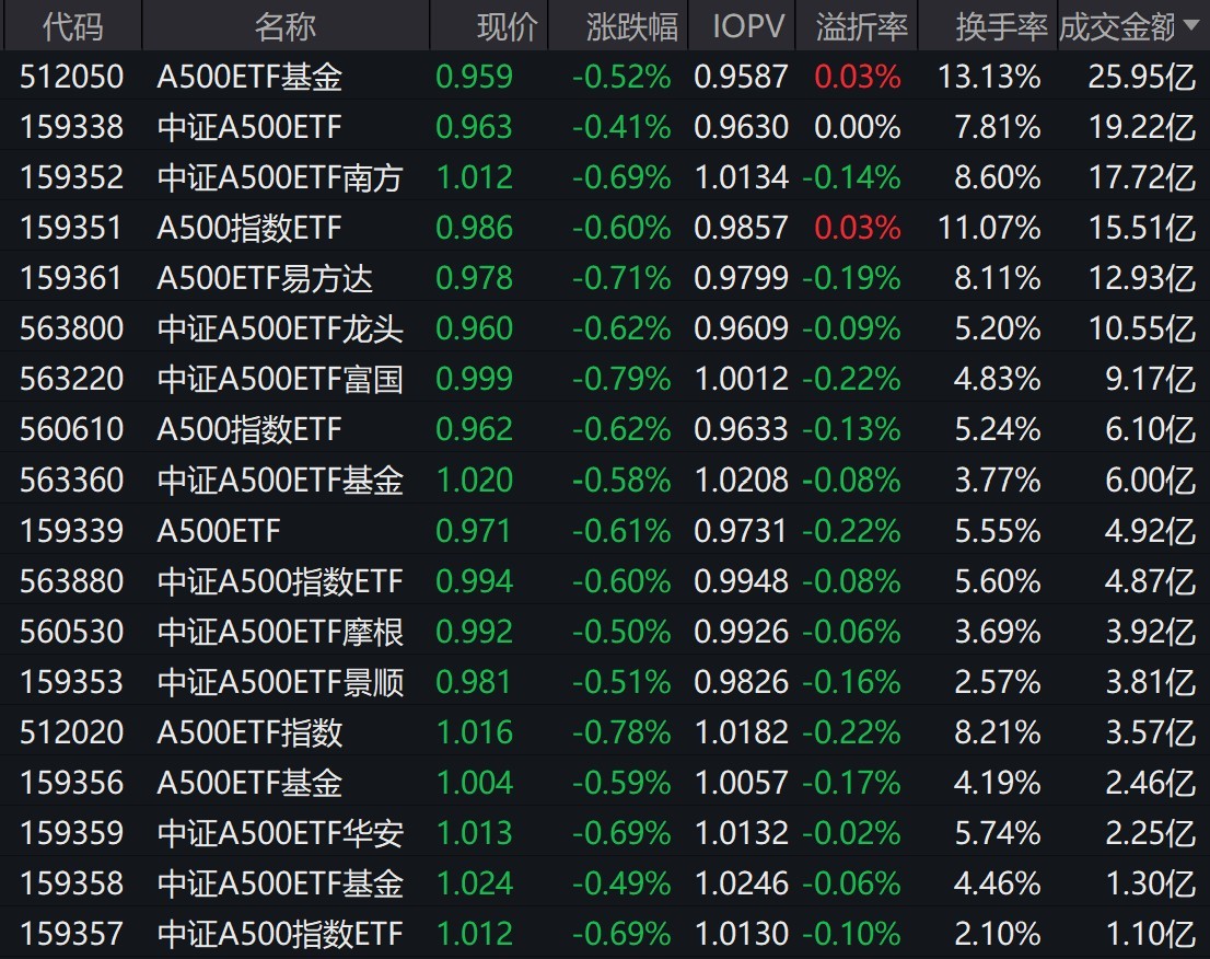 每经记者 叶峰 每经编辑 肖芮冬 市场早盘震荡调整,创业板指领跌。中证A500指数下跌0.59%,成分股中,爱美客、利亚德涨超13%,奥飞娱乐涨停。 截至上午收盘,场内29只跟踪中证A500指数的ETF小幅下跌,其中有18只中证A500相关ETF成交额超1亿元,6只超10亿元,A500ETF基金、中证A500ETF、中证A500ETF南方早盘成交额分别为25.95亿元、19.22亿元、17.72亿元。 此外,有3只中证A500相关ETF换手率超10%,其中A500ETF永赢早盘换手率达18.61%。 有券商表示,短期市场情绪受到美股大幅回调影响,部分短线资金可能阶段性流出。然而,两会政策进一步明确了资本市场定位的提升,并强化了全面支持科技创新的政策基调,为中短期风险偏好提供支撑。 |
