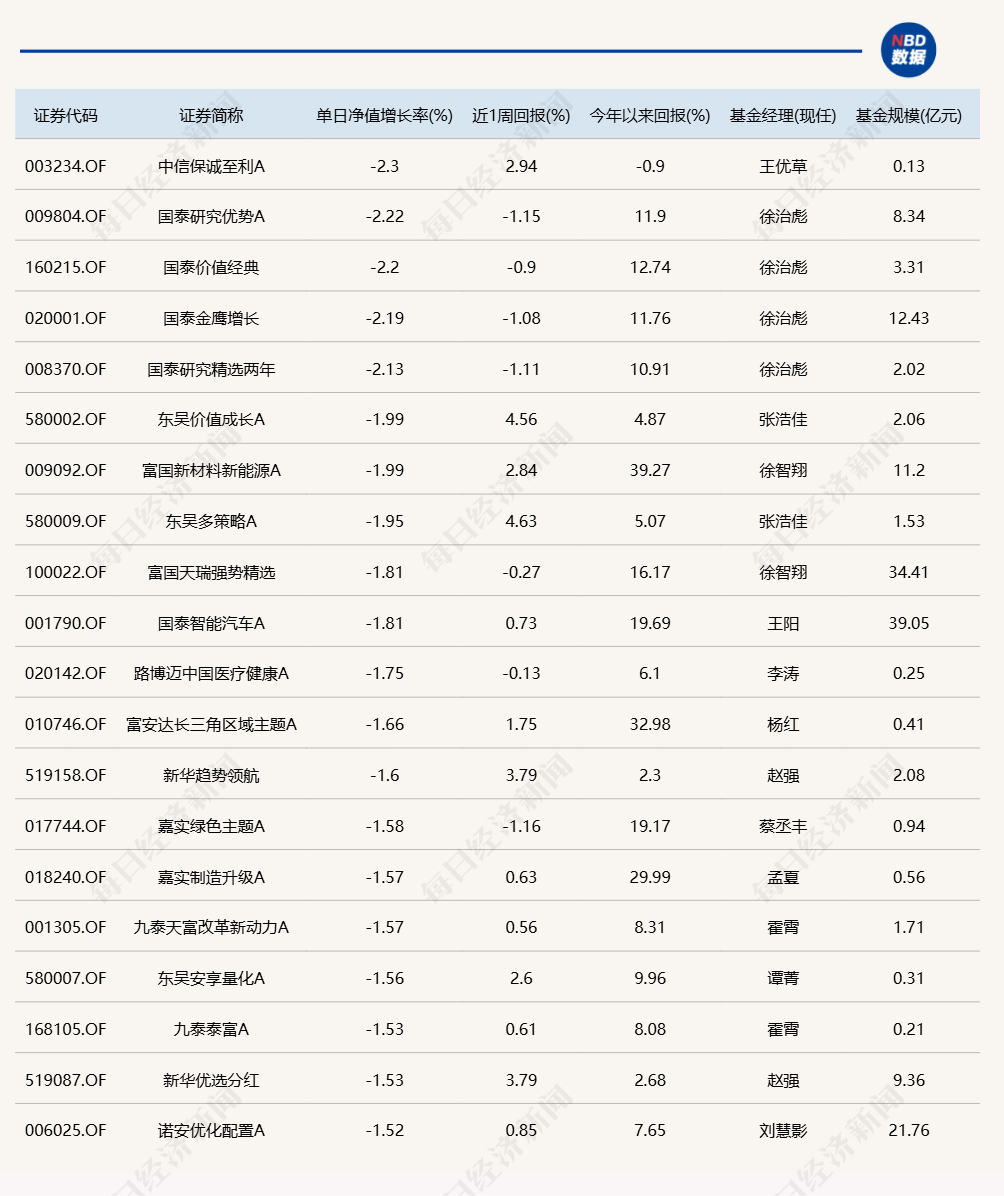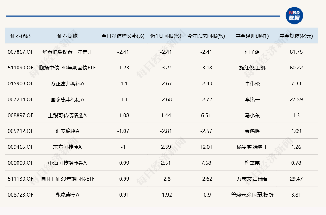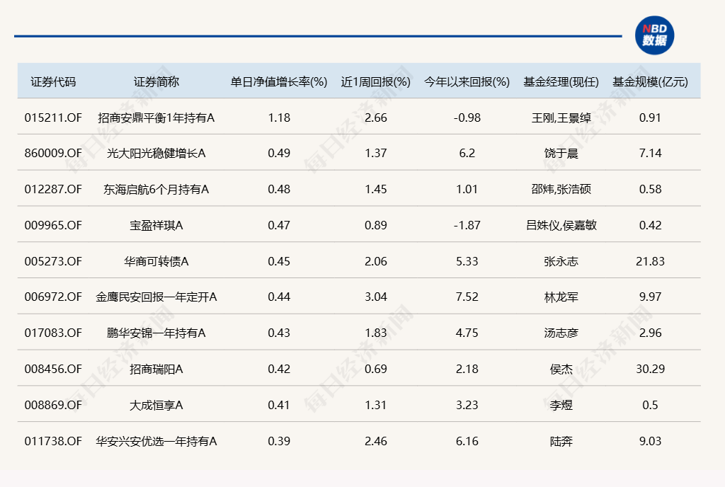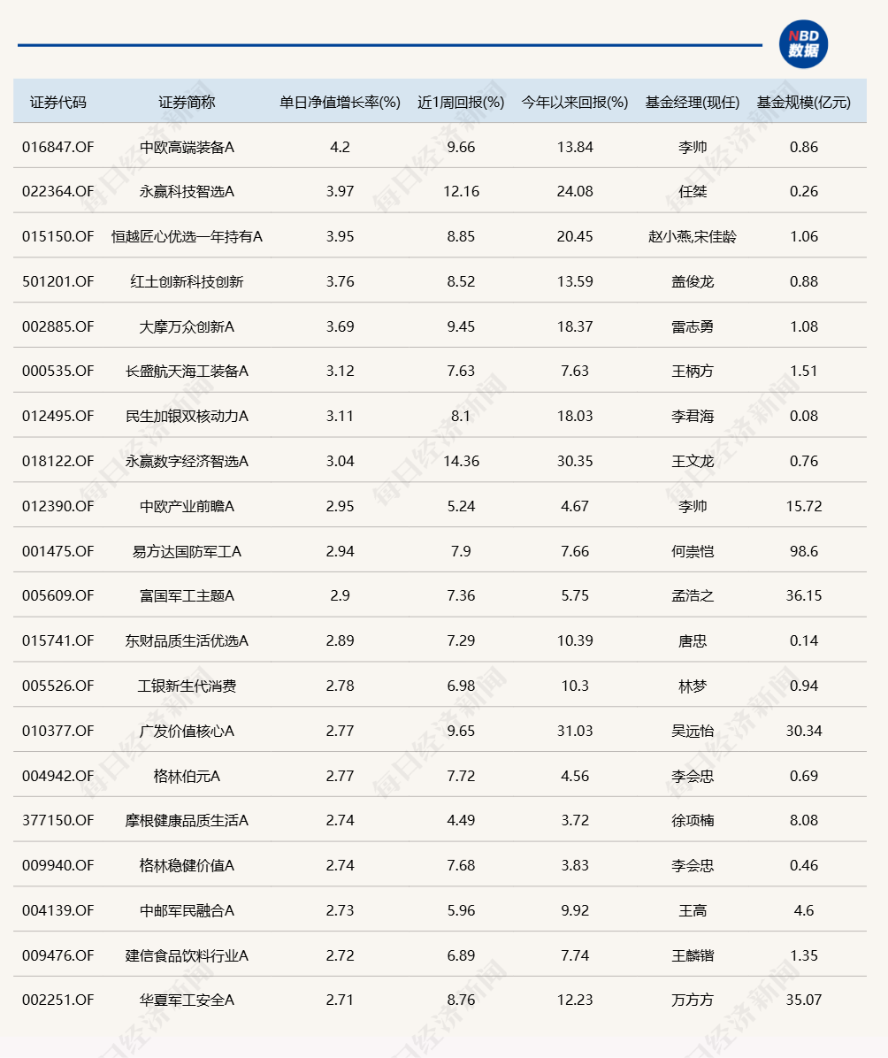 每经记者 肖芮冬 每经编辑 赵云 3月11日,市场全天低开高走,三大指数均收光头阳线。板块方面,军工、小金属、猪肉、国资云等板块涨幅居前,光刻机、AI医疗、软件开发、CRO等板块跌幅居前。全市场超2800只个股上涨。沪深两市全天成交额1.48万亿元,较上个交易日缩量238亿。 下面一起来看今天公募基金的表现。 (注:榜单1、2仅选取灵活配置型、偏股混合型和普通股票型三类产品作为主动基金的代表,纳入统计;债基相关榜单包括各类主、被动债券型基金) 1.单日涨幅榜 2.单日跌幅榜 3.单日债基涨跌幅榜 4.晚间值得关注的消息 |