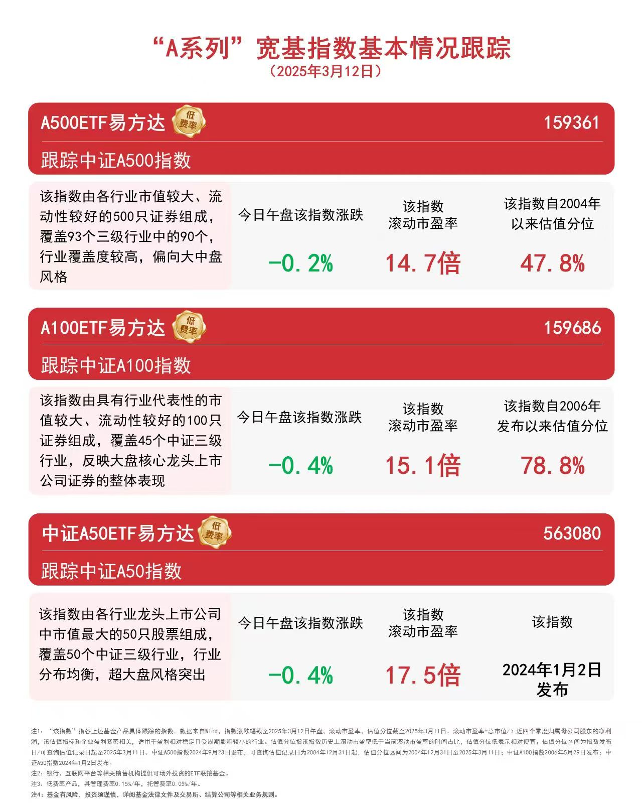 截至午盘,中证A500指数下跌0.2%,中证A100指数下跌0.4%,中证A50指数下跌0.4%。中证A500指数相关产品成交活跃,其中A500ETF易方达(159361)半日成交额达11.9亿元。 ...