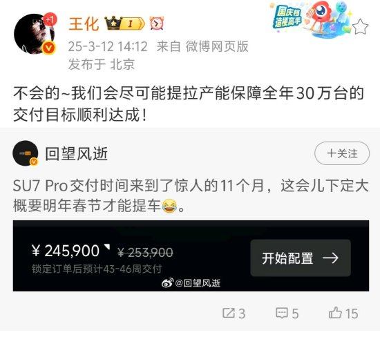 0小米集团公关部总经理王化回复称,SU7 Pro交付时间不会延长到明年春节,他们会尽可能提升产能以确保全年30万台的交付目标顺利达成。