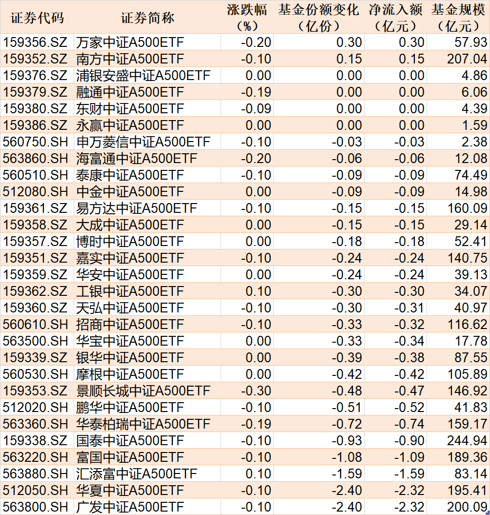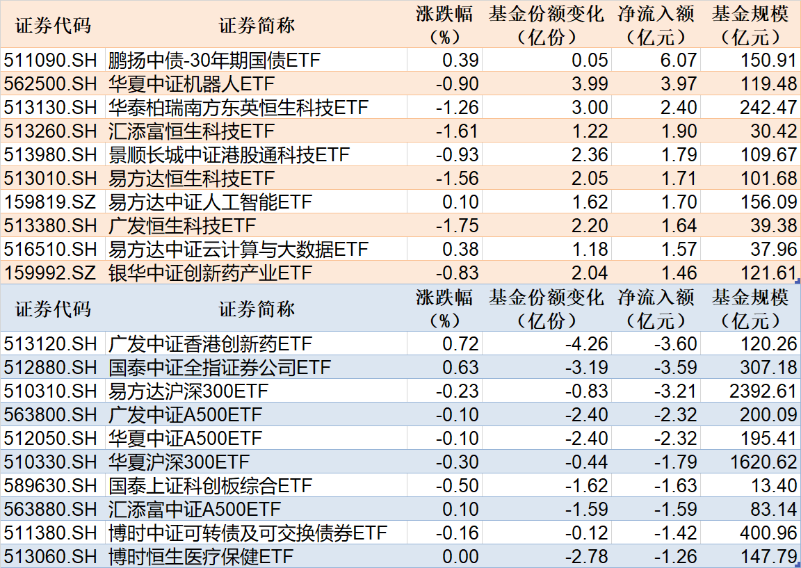 每经记者 叶峰 每经编辑 彭水萍 昨日市场全天冲高回落,三大指数小幅下跌,沪指盘中一度创出年内新高。从板块来看,算力概念股再度走强,数据中心电源概念股一度冲高。下跌方面,有色金属等周期股展开调整。 Wind数据显示,在3月12日的非货币ETF市场中,鹏扬中债-30年期国债ETF净流入额6.07亿元,基金份额增加0.05亿份;华夏中证机器人ETF净流入额3.97亿元,基金份额增加3.99亿份;华泰柏瑞南方东英恒生科技ETF净流入额2.40亿元,基金份额增加3.00亿份。 与此同时,广发中证香港创新药ETF净流出额3.60亿元,基金份额减少4.26亿份;国泰中证全指证券公司ETF净流出额3.59亿元,基金份额减少3.19亿份;易方达沪深300ETF净流出额3.21亿元,基金份额减少0.83亿份。 此外,昨日场内29只中证A500ETF合计净流出12.82亿元。 总体看来,Wind数据显示,3月12日全市场ETF份额达到26089.63亿份;总规模为38235.67亿元。份额增加最大的行业为消费,目前有10只基金跟踪;份额增加最大的主题为中证机器人指数,有5只基金跟踪。份额增加最大的指数标的为恒生科技(+1.10%),有10只基金跟踪;收益最高的指数标的为中证影视(+2.42%),有2只基金跟踪。 |