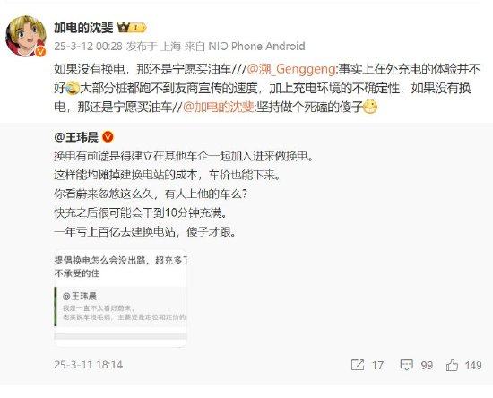 同辰科技讯 3月13日午间消息,近日,有微博博主提出对蔚来换电路线的质疑,引发蔚来高管怒怼。 该博主表示,“换电有前途是得建立在其他车企一起加入进来做换电。这样能均摊掉建换电站的成本,车价也能下来。你看蔚来忽悠这么久,有人上他的车么?快充之后很可能会干到10分钟充满。一年亏上百亿去建换电站,傻子才跟。 ” 蔚来副总裁沈斐@加电的沈斐 则回应称,“坚持做个死磕的傻子”,他随后又补充道“如果没有换电,那还是宁愿买油车”。