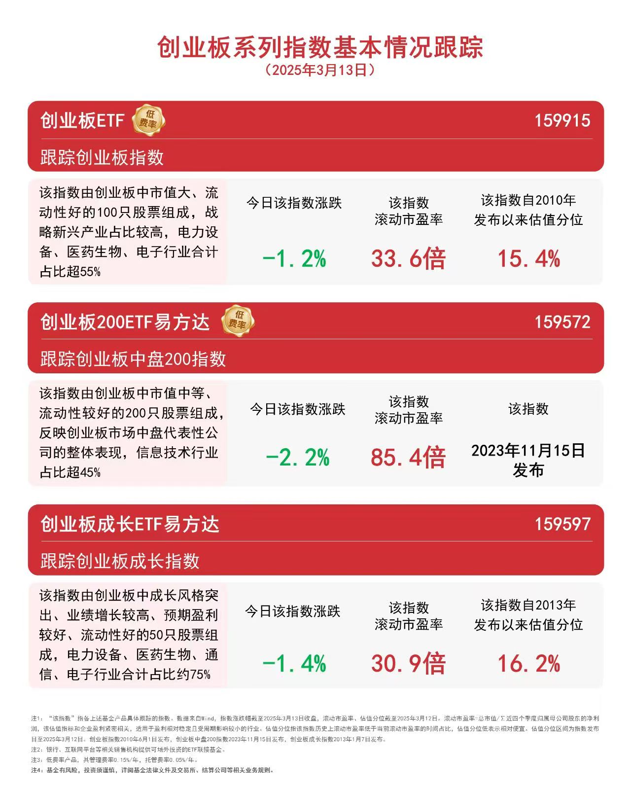 截至收盘,创业板指数下跌1.2%,创业板成长指数下跌1.4%,创业板中盘200指数下跌2.2%。 创业板聚焦成长型创新创业企业,新兴产业、高新技术企业占比较高,成长性突出。目前,创业板成长指数、创业板指数滚动市盈率均在35倍以下,估值均位于指数发布以来20%分位以下,配置价值受到关注。 |