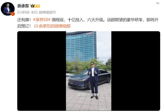 同辰科技讯 3月14日上午消息,华为常务董事、终端BG董事长、智能汽车解决方案BU董事长余承东在网络社交平台宣布,享界S9增程版,即将开启预订。 他表示,享界S9增程版投入10亿,实现6大升级,享界S9增程版也会搭载智慧大灯,在智慧、续航里程等6方面全面升级。