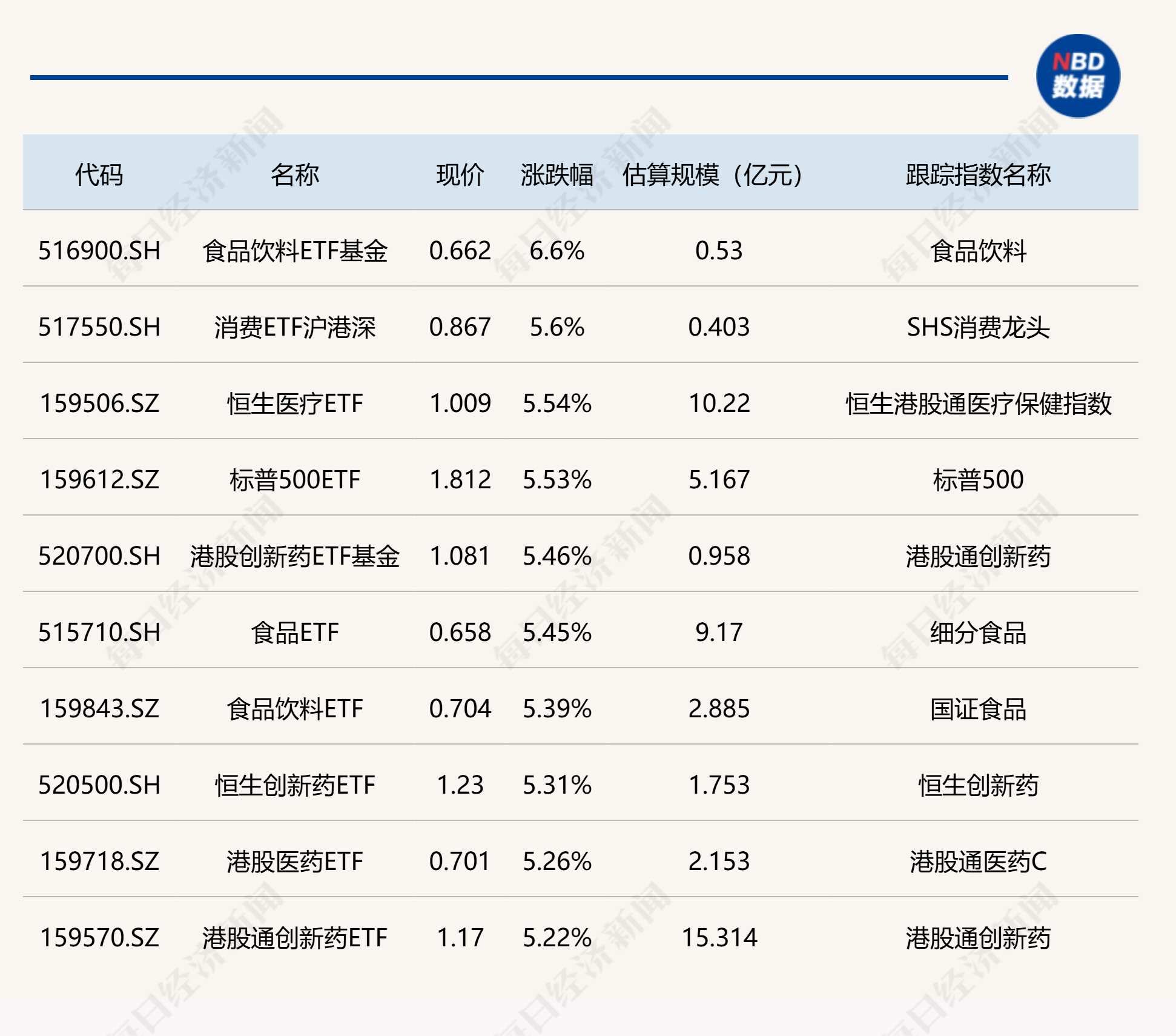 每经记者 叶峰 每经编辑 彭水萍 市场全天震荡走高,创业板指领涨,沪指重回3400点创年内新高。盘面上,市场热点集中在消费和金融等方向,个股涨多跌少,全市场超4400只个股上涨。从板块来看,大消费股震荡走强,婴童概念方向爆发,大金融股一度冲高。 ETF涨跌幅方面,食品饮料、医疗、创新药等ETF大涨逾5%。 有券商表示,在今年政府工作报告中,2025年要大力提振消费、提高投资效益,全方位扩大国内需求等政策方向成为今年政策的重心之一。政策的乐观表态为后续消费复苏奠定了基础,建议关注食品饮料底部机会。 此外,医药股前期跌幅大,估值便宜,市场步入牛市,医药股有望获得市场资金的青睐。从半年到一年维度看,2025年医药板块最大投资机会将围绕于两条主线:创新药和仿创药的板块高景气度投资机会,以及器械、中药、药店、消费医疗服务等领域的个股见底反弹投资机会。 下跌方面,标普油气ETF跌幅居前。 |
