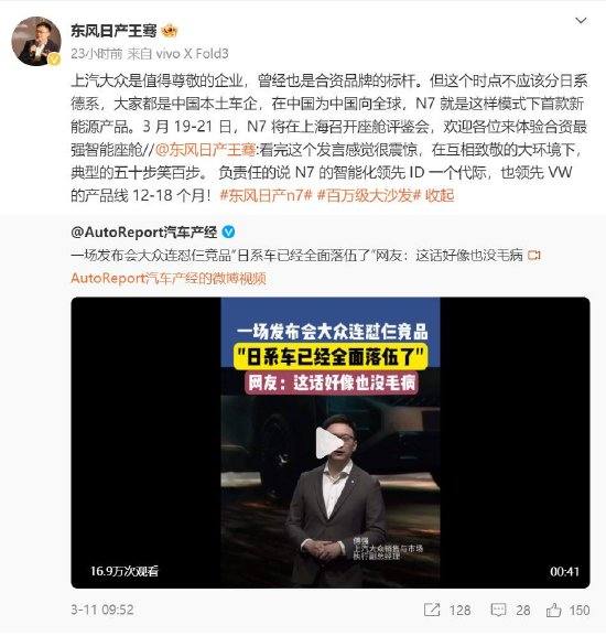 03月17日上午,上汽大众销售与市场执行副总经理傅强在新品发布会上评价竞品引发争议。他认为日系车已经全面落伍,BBA智能化相对落后,新势力缺少走四方的能力。东风日产汽车销售有限公司新能源品牌总经理王骞在微博上 ...