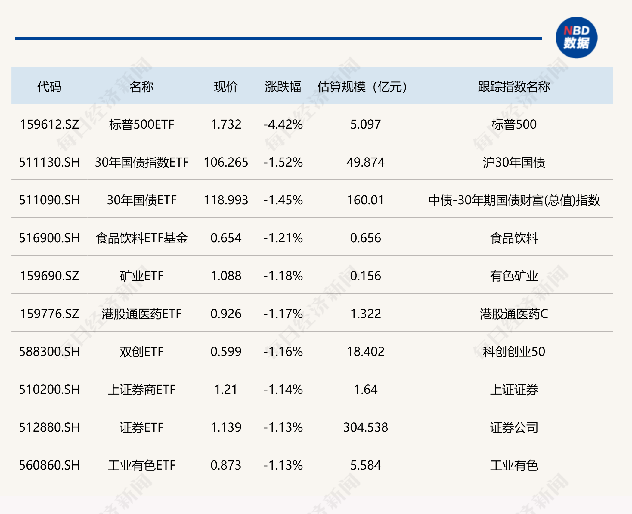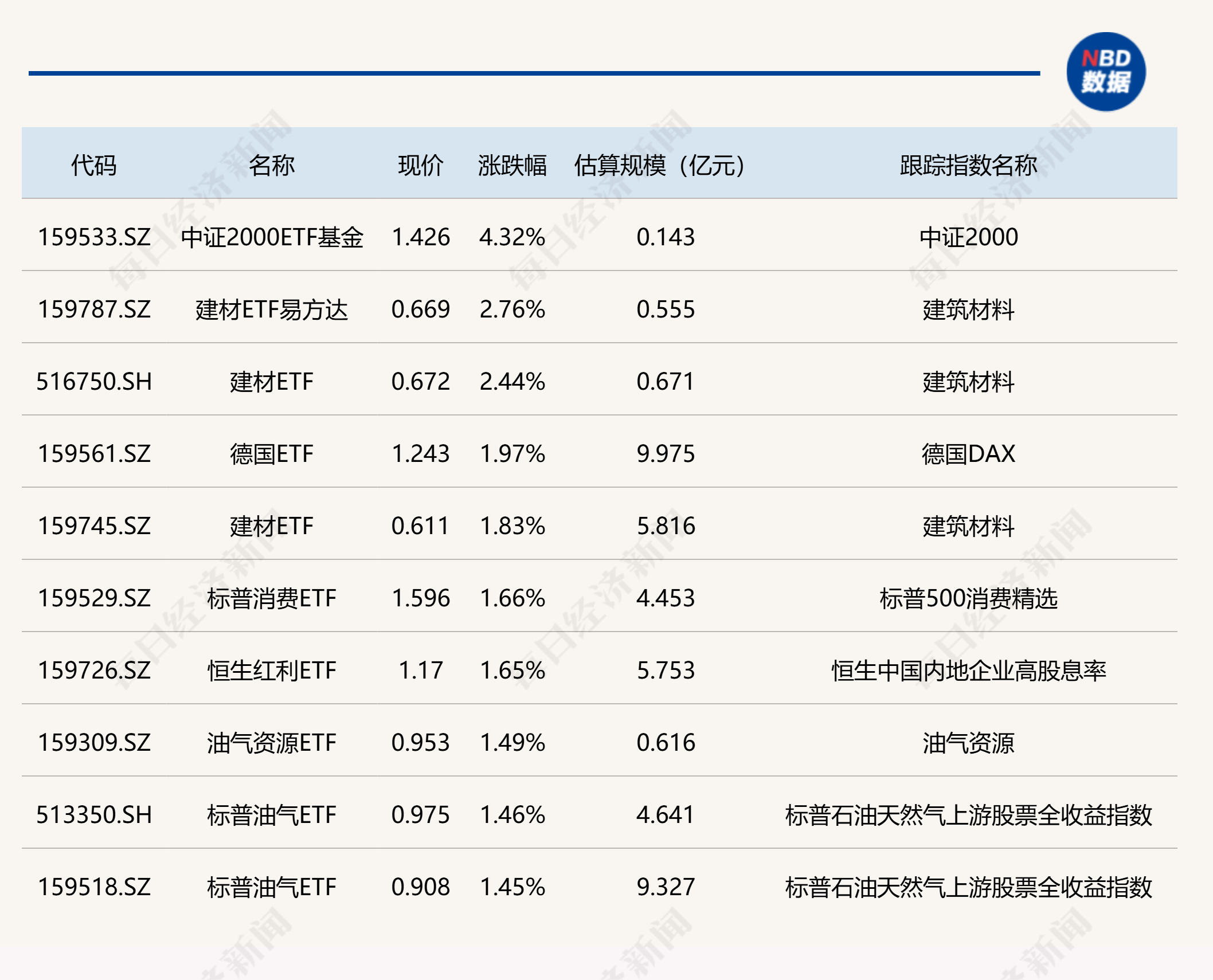 每经记者 叶峰 每经编辑 肖芮冬 市场全天窄幅震荡分化,三大指数涨跌不一。从板块来看,深海科技概念股延续强势,机器人概念股反复活跃,乳业股冲高回落。下跌方面,有色概念股陷入调整。 ETF涨跌幅方面,中证2000ETF基金涨超4%,建材相关ETF涨超2%。 有券商表示,参考消费建材板块历史经验和当前的竞争态势来看,在地产行业资金缓和+信心从底部逐渐恢复的阶段,部分公司或将率先借助渠道领先布局、经营效率优势或融资加杠杆等进一步提升份额,进入新的扩张周期,发货或订单增速的拐点可作为右侧信号。 下跌方面,标普500ETF跌逾4%。 |