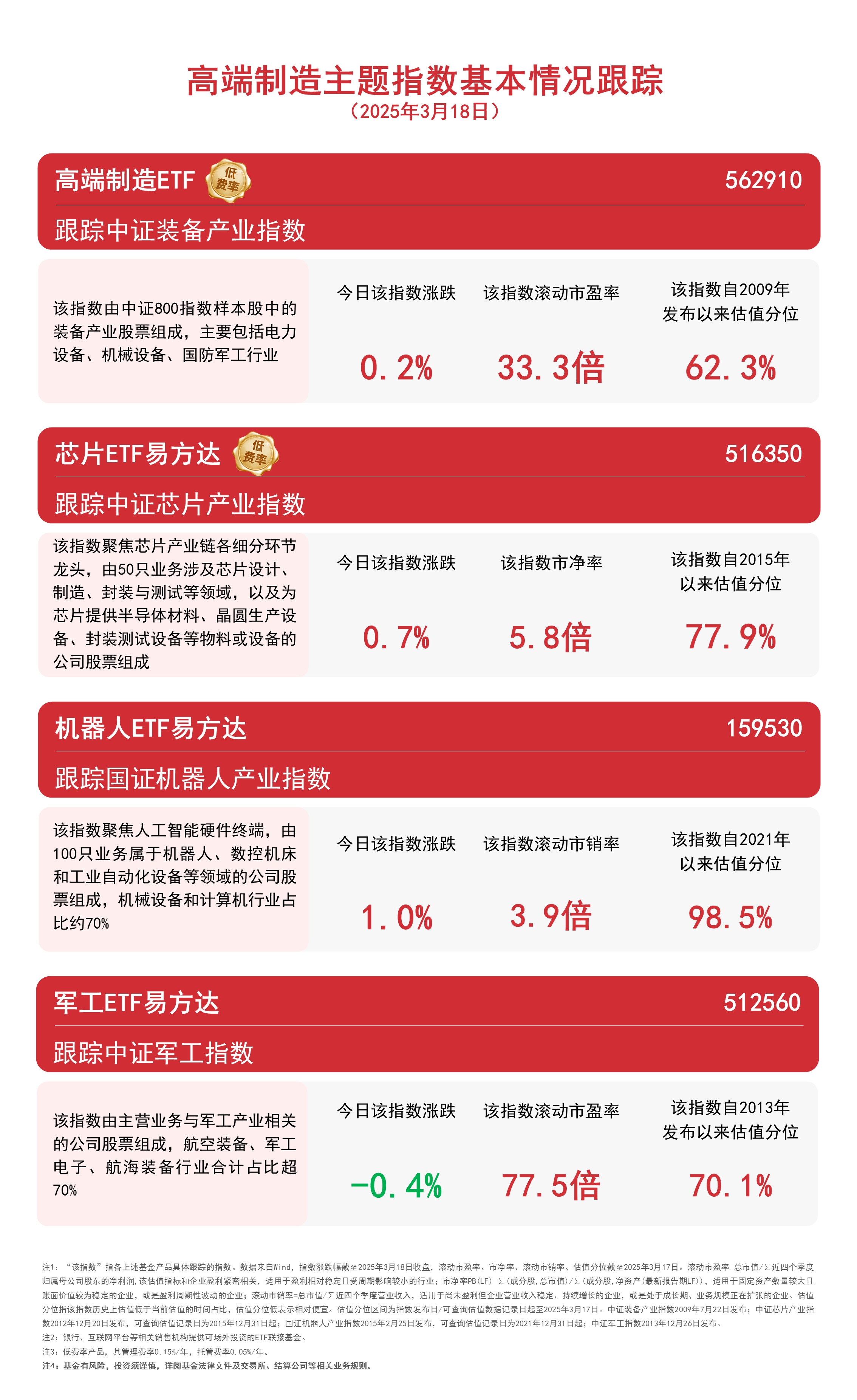 今日,机器人板块午后持续活跃,半导体板块反弹。截至收盘,国证机器人产业指数上涨1%,中证芯片产业指数上涨0.7%,中证装备产业指数上涨0.2%,中证军工指数下跌0.4%。 |