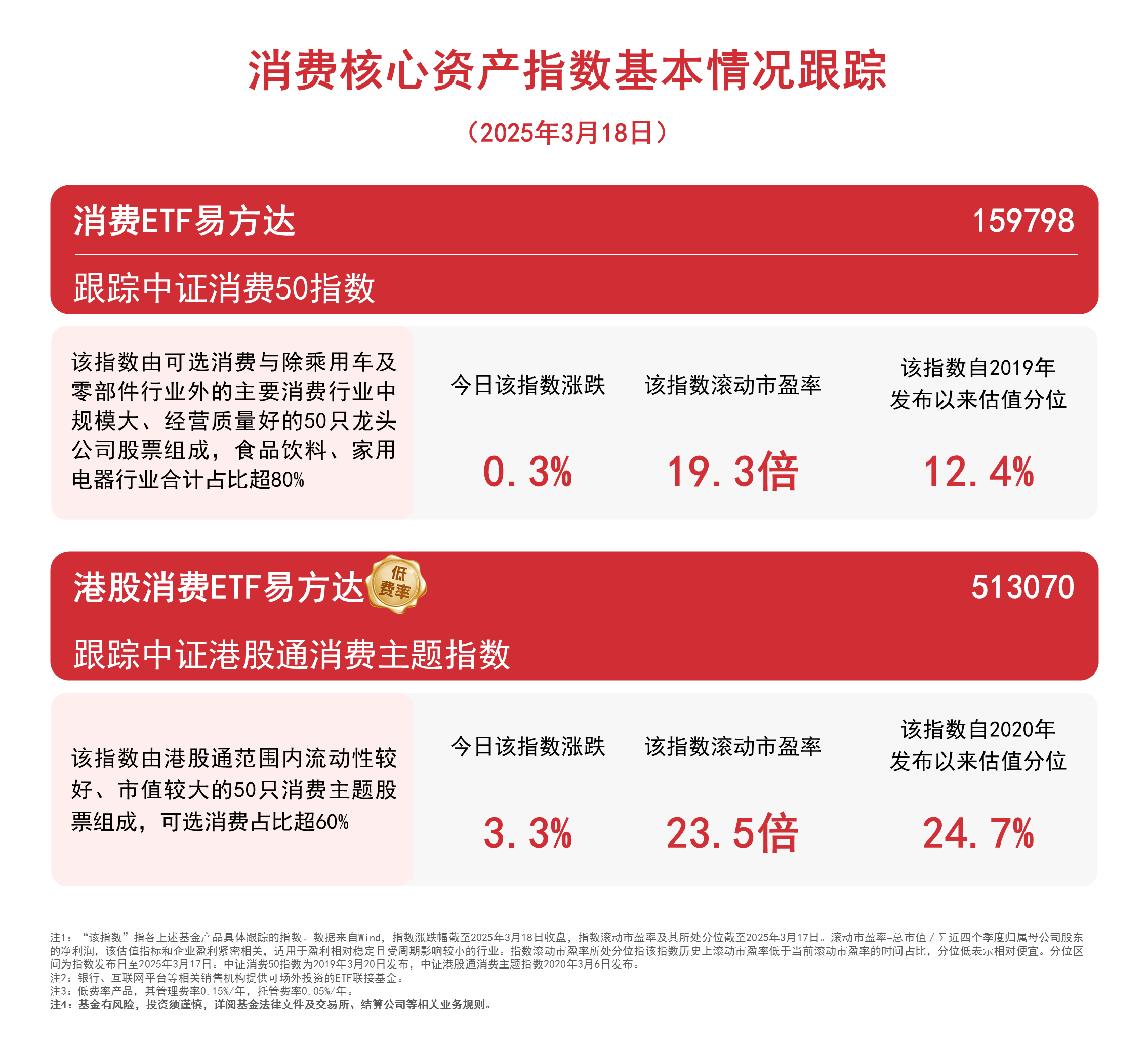 截至收盘,中证港股通消费主题指数上涨3.3%,中证消费50指数上涨0.3%。 商务部数据显示,截至3月16日,全国汽车以旧换新申请量合计超过132万份,消费者购买12大类家电以旧换新产品超过2600万台,4100多万名消费者申 ...