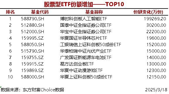 0每经AI快讯,据东方财富Choice数据统计,昨日共11只股票型ETF当日份额增加超1亿份,博时科创板人工智能ETF增加19.93亿份,国泰中证全指证券公司ETF增加3.02亿份。 ...