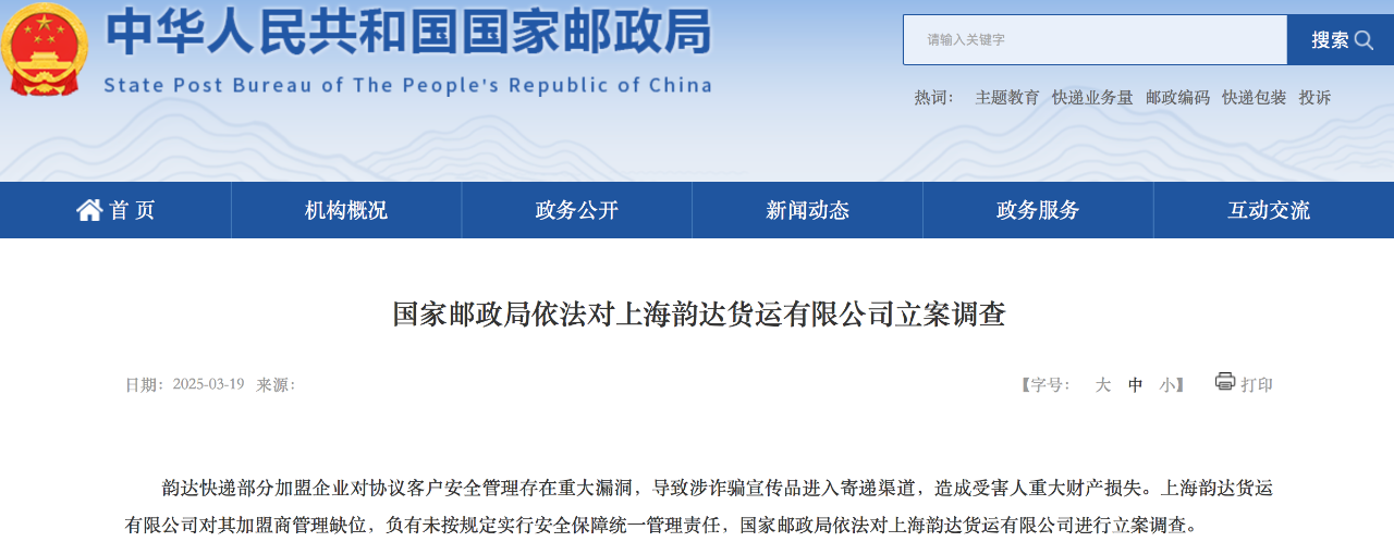 每经记者 赵雯琪 每经编辑 杨夏 3月19日,据国家邮政局官网消息,韵达快递部分加盟企业对协议客户安全管理存在重大漏洞,导致涉诈骗宣传品进入寄递渠道,造成受害人重大财产损失。上海韵达货运有限公司对其加盟商管理缺位,负有未按规定实行安全保障统一管理责任,国家邮政局依法对上海韵达货运有限公司进行立案调查。 ![]() 图片来源:国家邮政局官网