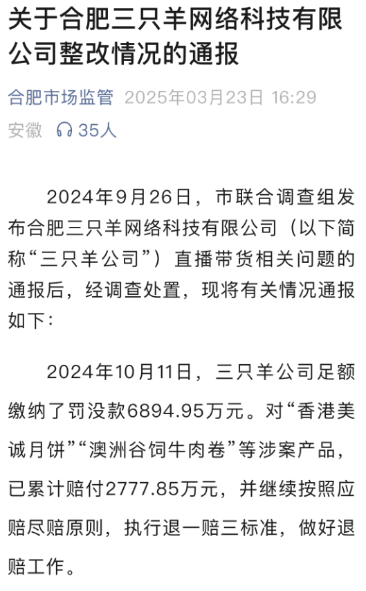 每经记者 王郁彪 每经实习编辑 余婷婷 整改、停播半年,“疯狂小杨哥”或有望复出。 针对此前合肥三只羊网络科技有限公司(以下简称“三只羊”)直播带货相关问题,3月23日,合肥市联合调查组发布通报称,经“三只羊”申请,合肥市联合调查组组织相关主管部门和律师、消费者代表等进行综合评估,认为其整改符合要求,具备恢复经营条件。 去年因“香港美诚月饼风波”等“三只羊”被停播、罚款。从通报内容看,其已足额缴纳罚款,针对涉案产品进行赔付,同时制定具体整改措施89项。 对于“三只羊”可能很快复播的消息,多数消费者依然保持“观望”甚至“质疑”的态度,加之近段时间直播电商平台带货政策收紧,加码扶持“店播”等形势,小杨哥重回带货江湖之路可能并不好走。 ![]() 图片来源:合肥市场监管公众号截图