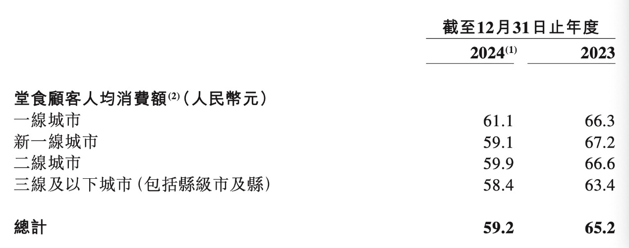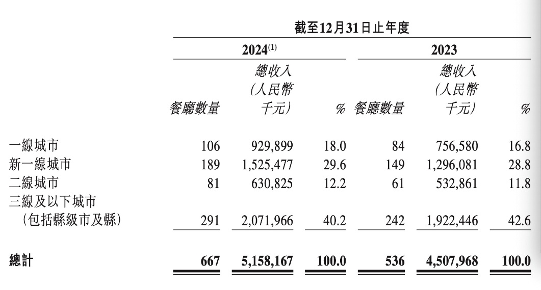 财报显示,2024年,小菜园全国门店数量总计667家,其中,在一线城市、新一线城市和二线城市的餐厅数分别为106家、189家、81家,分别贡献总收入的18%、29.6%、12.2%,在三线及以下城市分布则有291家门店,贡献了小菜园总收入的40.2%。可以看出,一二线城市仍然是小菜园收入的主要来源,且同比2023年收入有所增长,新一线城市整体收入增长最多。 ![]() 图片来源:小菜园2024年财报截图