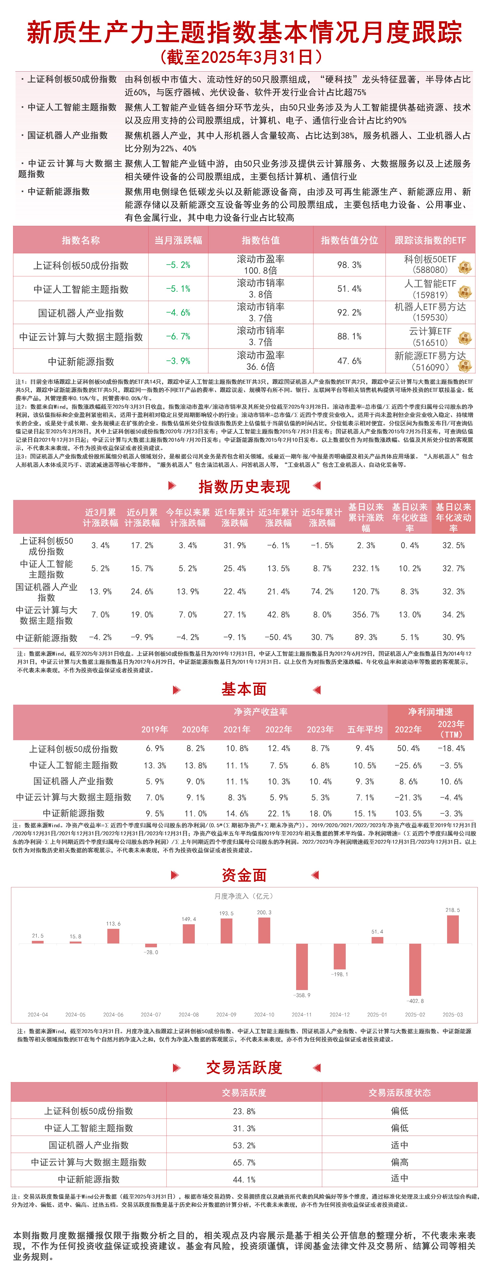 3月,中证新能源指数下跌3.9%,国证机器人产业指数下跌4.6%,中证人工智能主题指数下跌5.1%,上证科创板50成份指数下跌5.2%,中证云计算与大数据主题指数下跌6.7%,合计超200亿元资金净流入跟踪以上指数的ETF。