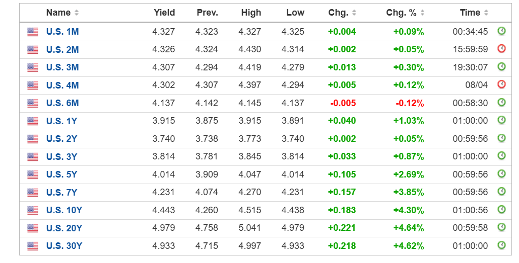 美债正在面临超级大抛盘!今天,美债收益率持续攀升,30年期收益率一度上行20个基点,上涨幅度一度接近5.4%;10年期收益率一度逼近4.5%,上涨幅度一度超过5%,其他各期限国债几乎全线杀跌。这也意味着,美国国债正面 ...