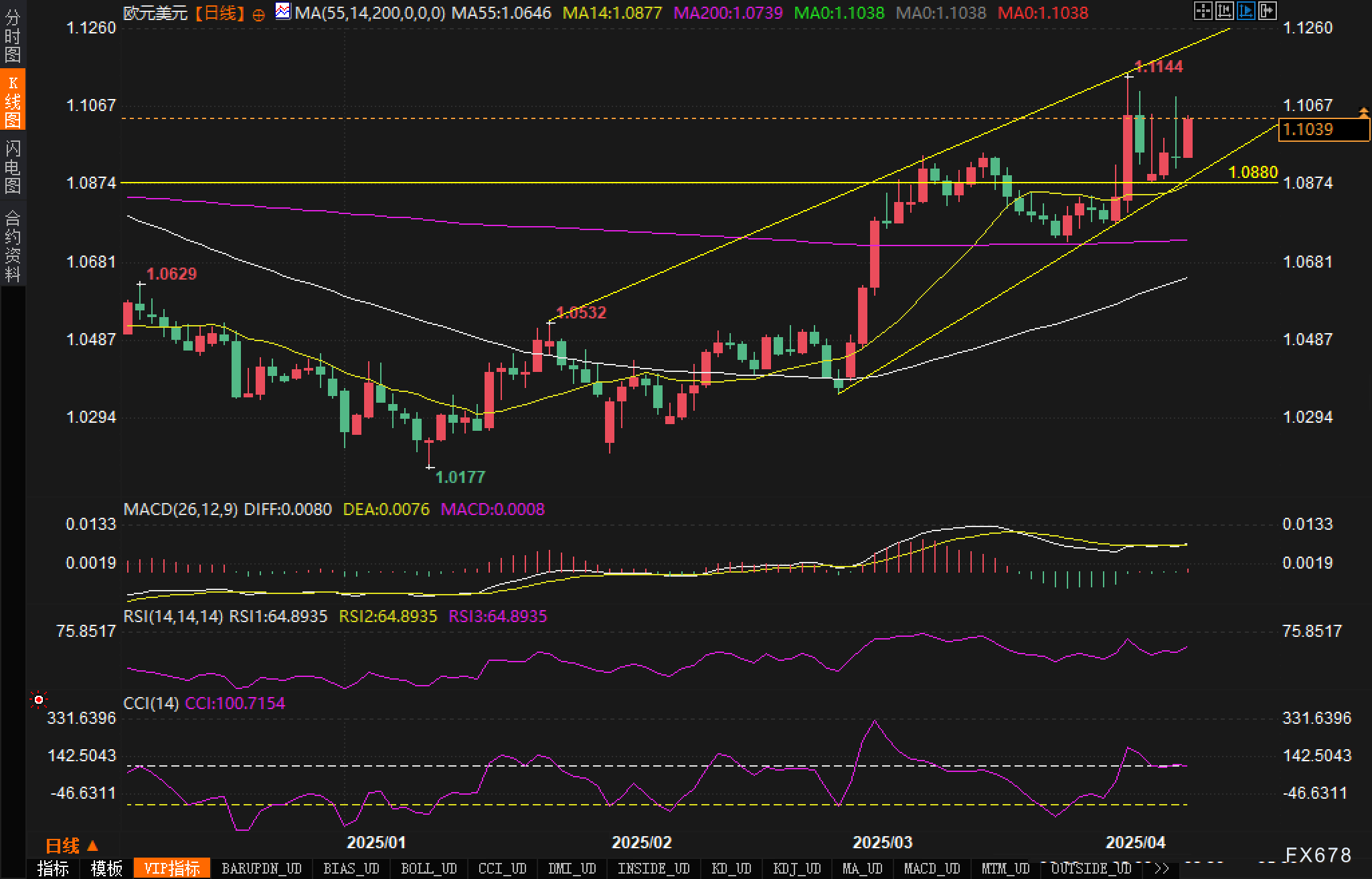 周四(4月10日),欧元兑美元汇价在美国关税政策引发贸易摩擦加剧的背景下迎来新一轮波动。昨日汇价先扬后抑,今日则再度走高,欧洲时段交投于1.1040附近,正在尝试突破关键阻力位。 ![]() 技术面分析师解读: 从4小时图来看,欧元兑美元已完成对前期下跌趋势的有效反转,并形成一个明显的上升三角形整理形态。当前汇价正在三角形上轨1.1050附近震荡,若能有效突破,将打开进一步上行空间。值得注意的是,汇价已经站稳在各期移动平均线之上,这是中期看涨信号。 ![]() 日线图展示出更为清晰的上升通道形态,自低点1.0177以来,欧元兑美元一直在这一通道内运行。近期汇价触及通道下轨后反弹,并突破1.0880水平阻力,显示出较强的动能。当前汇价在1.1050阻力位附近整理,为未来可能的突破蓄力。 ![]() 后市展望 短期展望:欧元兑美元正处于关键技术位置。若能有效突破1.1100阻力位,下一目标将指向前期高点1.1144。支撑方面,1.0980水平(上升三角形底边)将提供有效支撑,若跌破则可能回调至1.0880区域。今日美国CPI数据将成为短期走势的关键催化剂。 中长期展望:从技术形态看,欧元兑美元已确立上升通道,这一结构暗示中期趋势偏向看涨。然而,警惕通道上轨1.1144附近可能出现的获利了结压力。若美国通胀数据持续下降,美联储降息预期增强,欧元兑美元有望挑战1.12-1.13区域。反之,若基本面再度转向有利于美元,则需关注通道下轨的支撑情况,该位置破位将暗示中期趋势转变。 注:本文基本面内容据路孚特报道展开。 ![]() |