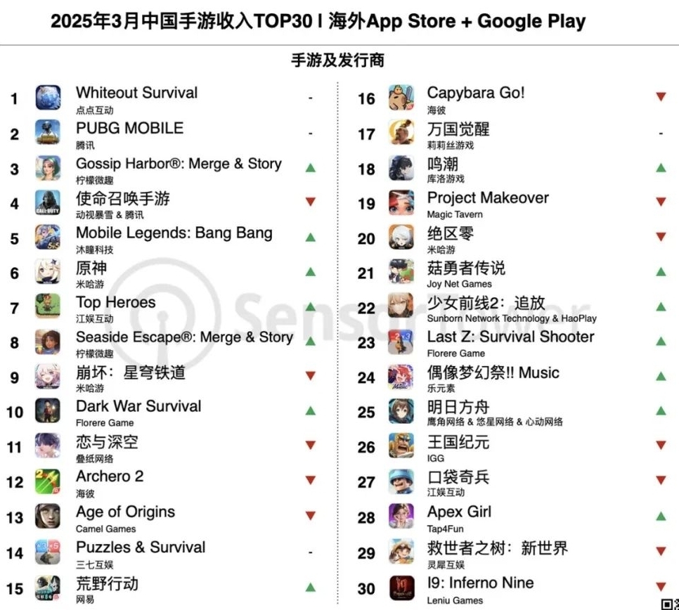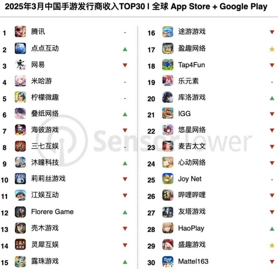 每经记者 李宇彤 每经实习编辑 余婷婷 4月14日,移动应用数据分析公司Sensor Tower公布了2025年3月中国手游的出海榜单。受益于多款游戏的新活动推出,中国手游厂商在海外市场表现突出,多款产品创下收入新高。 总体中国厂商收入方面,据Sensor Tower4月9日公布的“2025年3月中国手游发行商全球收入排行榜”显示,3月份,共36家中国厂商入围全球手游发行商收入榜TOP100,合计吸金20亿美元,占本期全球TOP100手游发行商收入的36.9%。对比2月份,收入占比表现稳定。 为市场关注的是, 3月“中国手游发行商收入TOP30”前五名分别为腾讯、点点互动、网易、米哈游和柠檬微趣。其中,点点互动再次爆发,力压网易。 ![]() 图片来源:Sensor Tower官方微信公众号