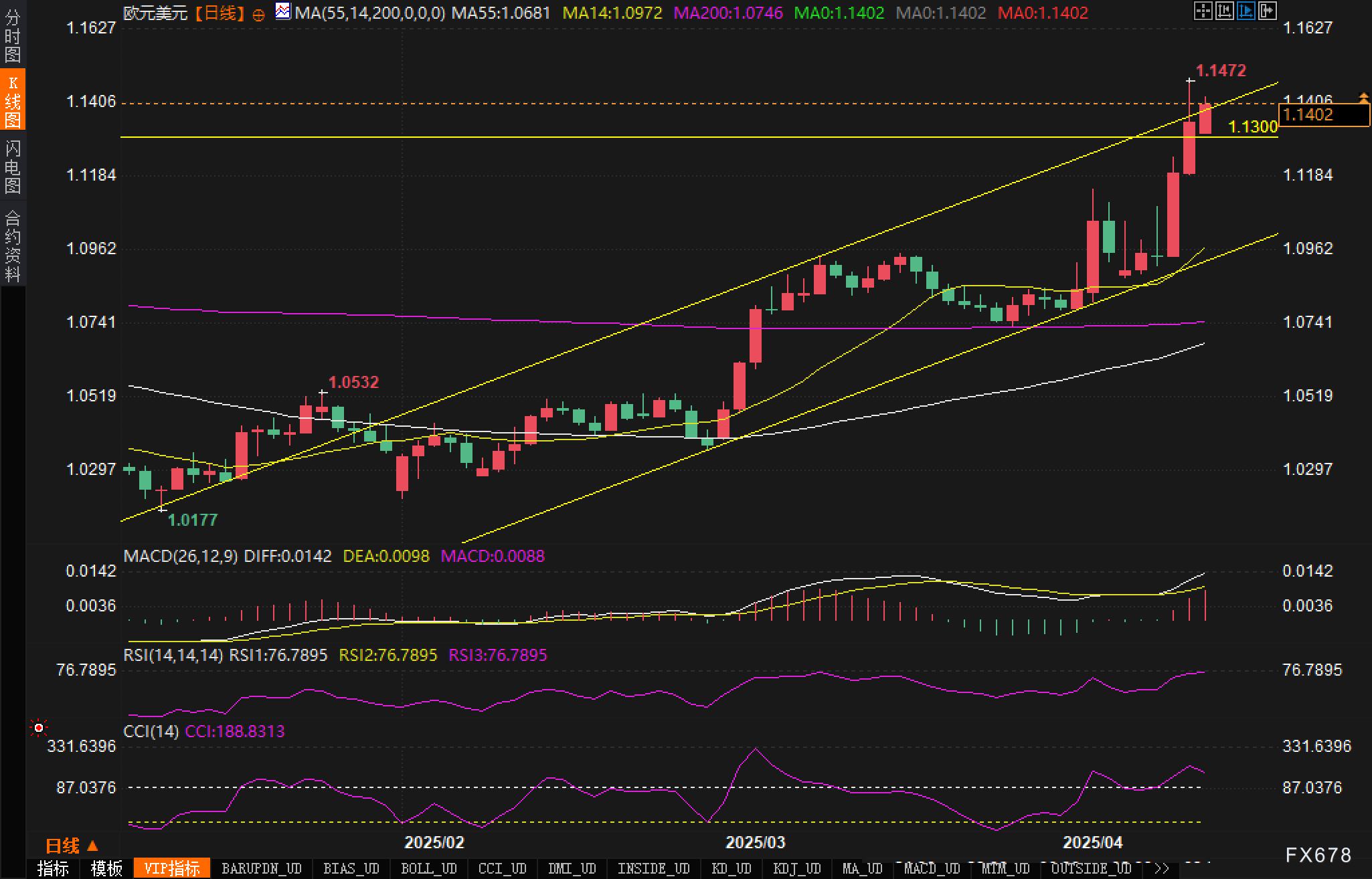 欧元 美元近期在国际贸易与政策环境的复杂交织下表现强势 连续数日交投于1 1100上方 并于上周触及1 1472阶段高点 4月14日 周一 欧洲时段 当前市场情绪依旧偏向乐观 由于美国方面对于关税政策的反复态度使市场对其经 ...