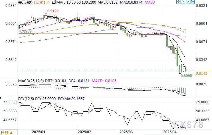 美元兑瑞郎在周三的亚洲交易时段吸引了新的卖家,并侵蚀了前一天小幅回升的大部分涨幅。现货价格回落至接近0.8100中位,最低触及0.8128,跌幅约1.28%,在美元普遍疲软的情况下,汇价逼近上周五触及的十年低点0.8098。 ![]() 北京时间4月16日14:47 美元兑瑞郎 报 0.8146/48。 ![]() |
