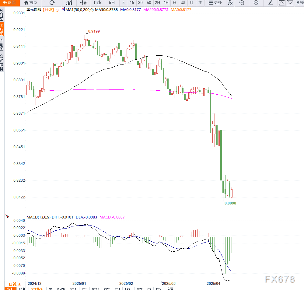 周四亚洲交易时段 USD CHF在0 8160附近盘整 距离前一交易日触及的0 8099历史低点仅一步之遥 这是自2011年9月以来的最低水平 自4月2日美国总统特朗普宣布新一轮关税调查以来 美元持续承压 瑞郎作为传统避险货币需求显 ...