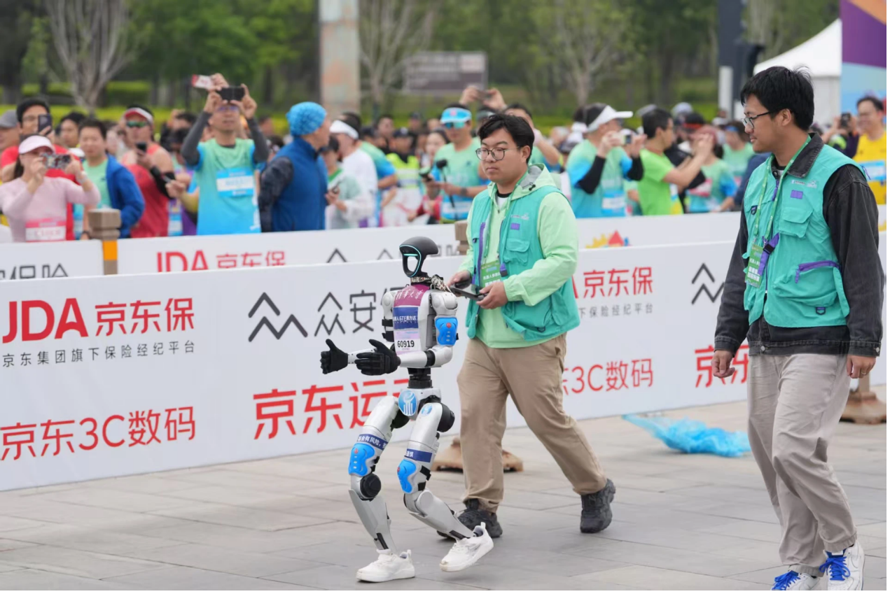 崔文昊告诉记者,他们本来希望是每支队伍都一台机器人完成比赛,但是可能因为上午很冷,下午很热造成的温差等原因,导致有一台机器人频繁死机,还是有一些不及预期。 此前记者在采访中了解到松延动力两支队伍参赛的机器人采取了不同的策略。“旋风小子”队力图展示机器人极限的运动能力,而另一支“小顽童”队则是尽可能稳定地跑完全程。 而本次参赛这款身高还不足1.2米,像个小朋友一样的机器人,在赛场和网络流传的视频中都得到了许多的关注。还有网友亲切地称N2为“小孩哥”。崔文昊表示,松延动力在现场也感受到了观众们的肯定,他们也感到很开心。 智平方创始人兼CEO郭彦东在微信回复《每日经济新闻》记者表示,北京人形机器人半程马拉松比赛体现出人形机器人在平坦道路上长时间行进的能力,能够很直观地检验人形机器人在运动控制、环境适应、续航能力等核心技术领域的突破。 人形机器人不是要取代人落到产业链上,尽管目前处于初级阶段仍是行业共识,但市场最为关注的变量——价格,已经较此前有了明显下探,为量产和更多科研尝试留下了空间。 举例来看,据部分人形机器人厂商的报价,2022年时单台的成本起码要超过百万元。3年后的今天,据优必选首席品牌战略官谭旻在近期接受《每日经济新闻》记者采访时透露,目前优必选已经将人形机器人的单机成本控制在了50万元以内。优必选联合北京人形机器人创新中心发布的全尺寸科研教育人形机器人天工行者,售价也仅为29.9万元。 在人形机器人产业链的逐步发展和机器人造价下探的前提下,不需自行制造机器人也能参与研发成为当前推动人形机器人产业发展的又一模式。 《每日经济新闻》记者就注意到,此次人形机器人马拉松比赛机就出现了并未报名,但却“实际到场”厂商。如赛程直播的过程中,不少网友在弹幕留言称:“蹲蹲宇树科技的机器人”,但其实宇树科技并未报名参与此次比赛。 据宇树科技相关工作人员介绍,现场确实有不少的宇树客户用自己的算法参与了比赛。“这次人形机器人马拉松,现场有不少我们的客户用他们自己的算法参与了比赛,所以在现场能看到不少我们的机器人。我们最近事情比较多,没时间好好准备比赛,和很多其他机器人公司类似就没直接参与了。不过我们一直在和主办方一起支持协助准备这次比赛,希望大家一起共同推动机器人行业的进步。”上述工作人员称。 ![]() 本体为宇树机器人的“参赛选手” 图片来源:受访者提供